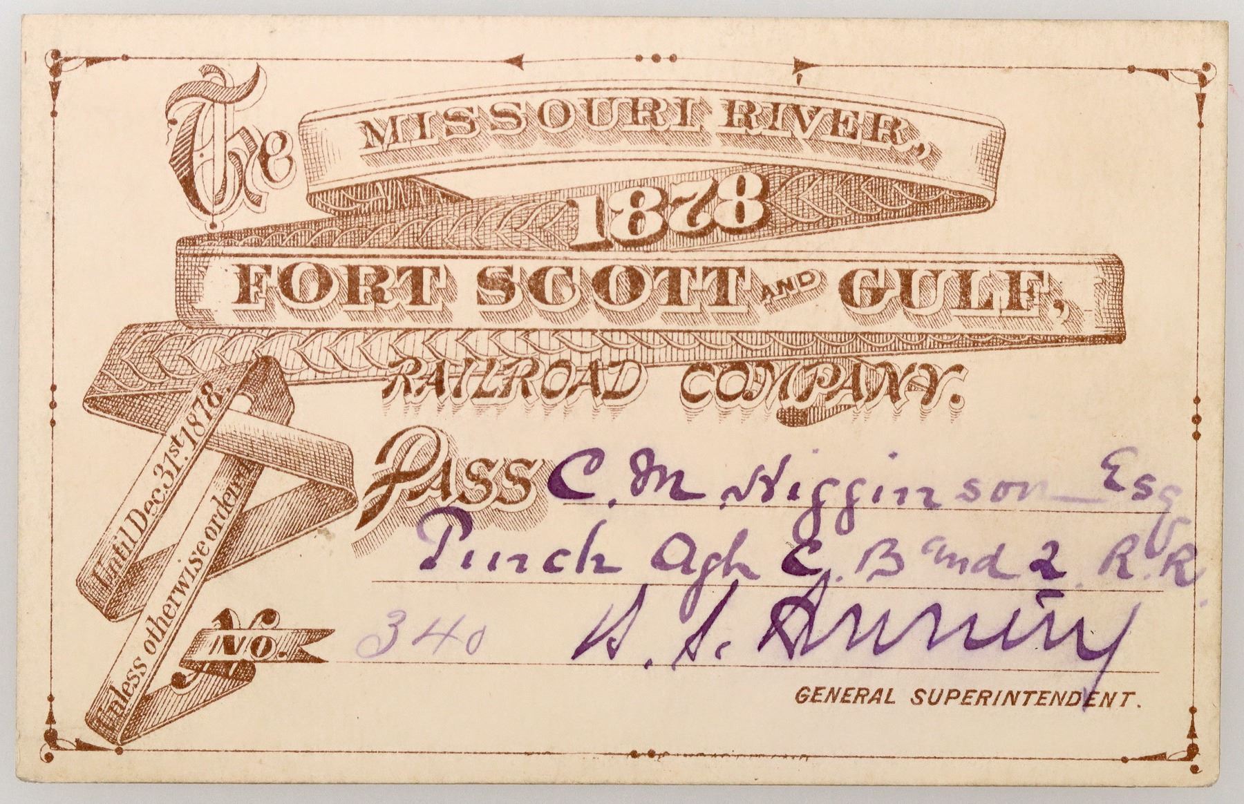 Pass no. 340 issued for 1878 to S. Higginson. Signed by the general superintendent. Illustrated logo with brown print. The Kansas City, Fort Scott and Gulf Railroad was first established as the Kansas & Neosho Valley Railroad in March 1865. However, it was taken over by a Boston group represented by a man named James F. Joy, president of the Chicago, Burlington, and Quincy Railroad system in August 1868. In October 1868, the corporate name of the railroad was changed to the Missouri River, Fort Scott & Gulf Railroad.