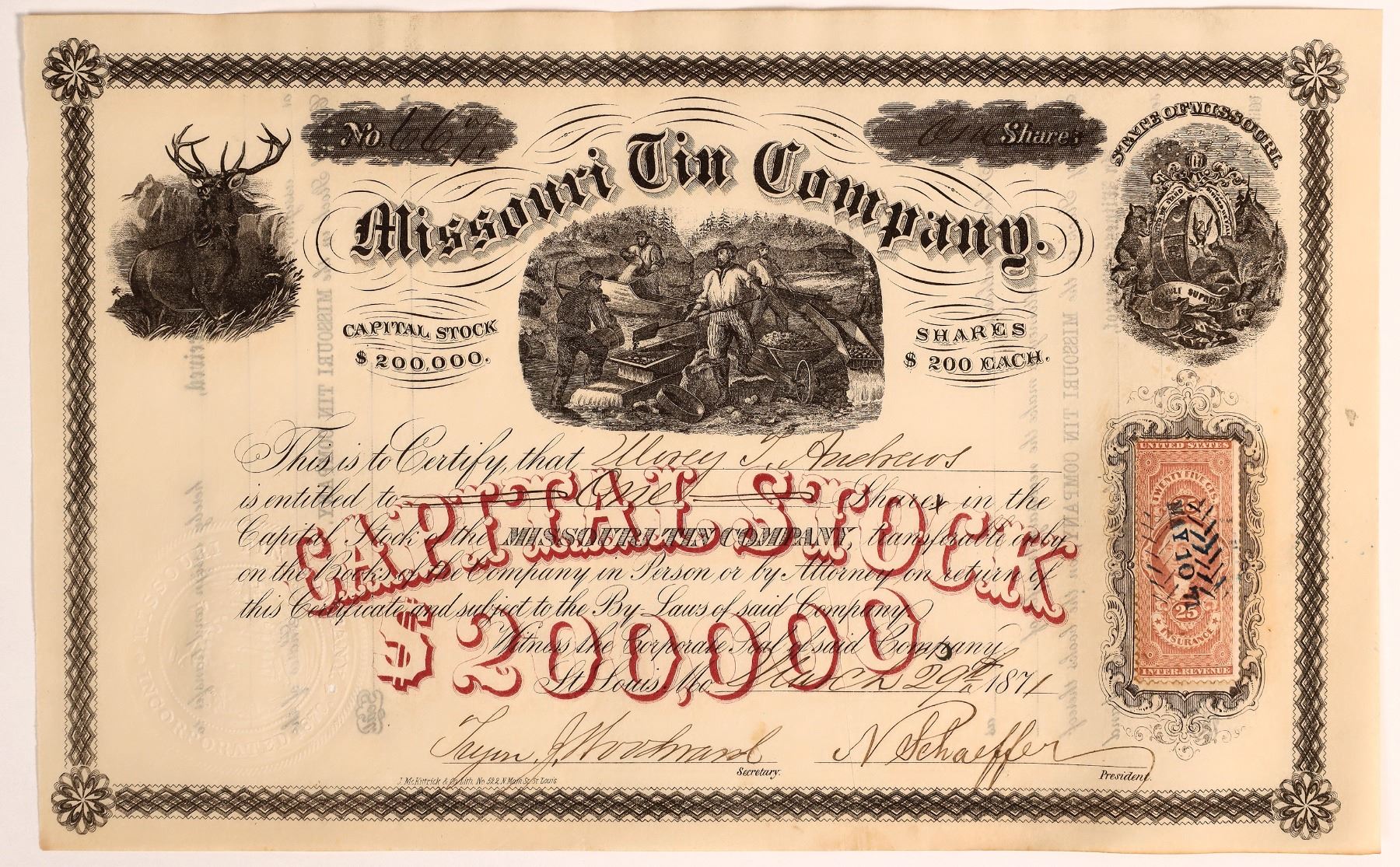 Very scarce. Inc. in State of Missouri. No. 66, issued for one share in St. Louis in 1871. Signed by president N. Schaeffer and secretary Woodward. Not cancelled. Black border and print, red underprint, and three vignettes: miners with sluice boxes (center), elk (left), and allegorical (upper right). Printed by J. McKittrick & Co., St. Louis. 25 cent adhesive revenue stamp attached on front right. 6.75 x 10.5" Creases, wavy borders. The company was a joint stock company, organized for the purpose of working the mines and to erect furnaces and machinery for the purpose of smelting tin (St. Louis, The Future Great City of the World, Reavis). St. Louis Missouri