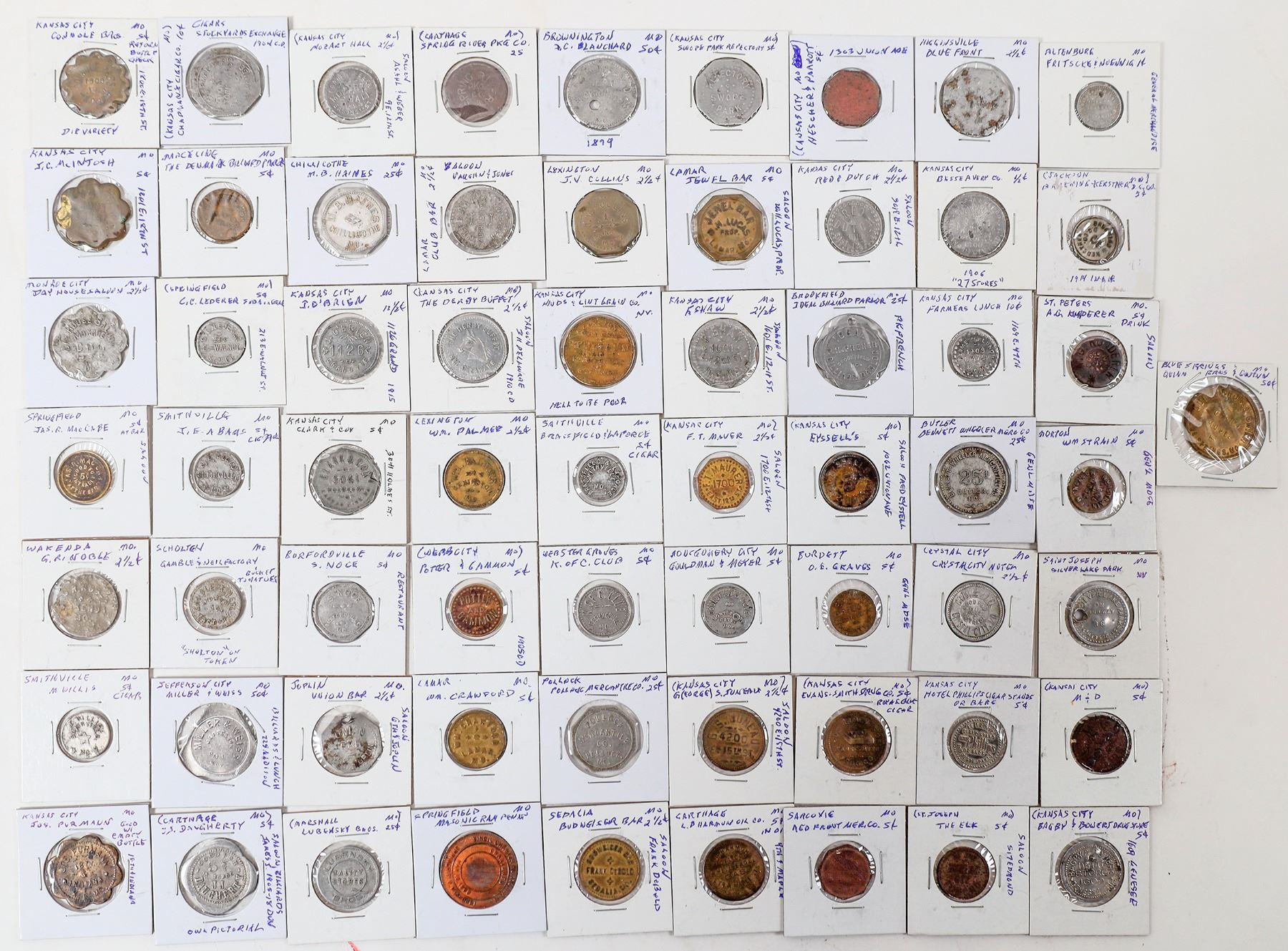 Collection of over 60 tokens from Missouri: 22 from Kansas City; 44 from other towns. Springfield; St. Peters; Lamar; Smithville; Jefferson City; Joplin; Lexington; Butler; Monroe City; Carthage, others.