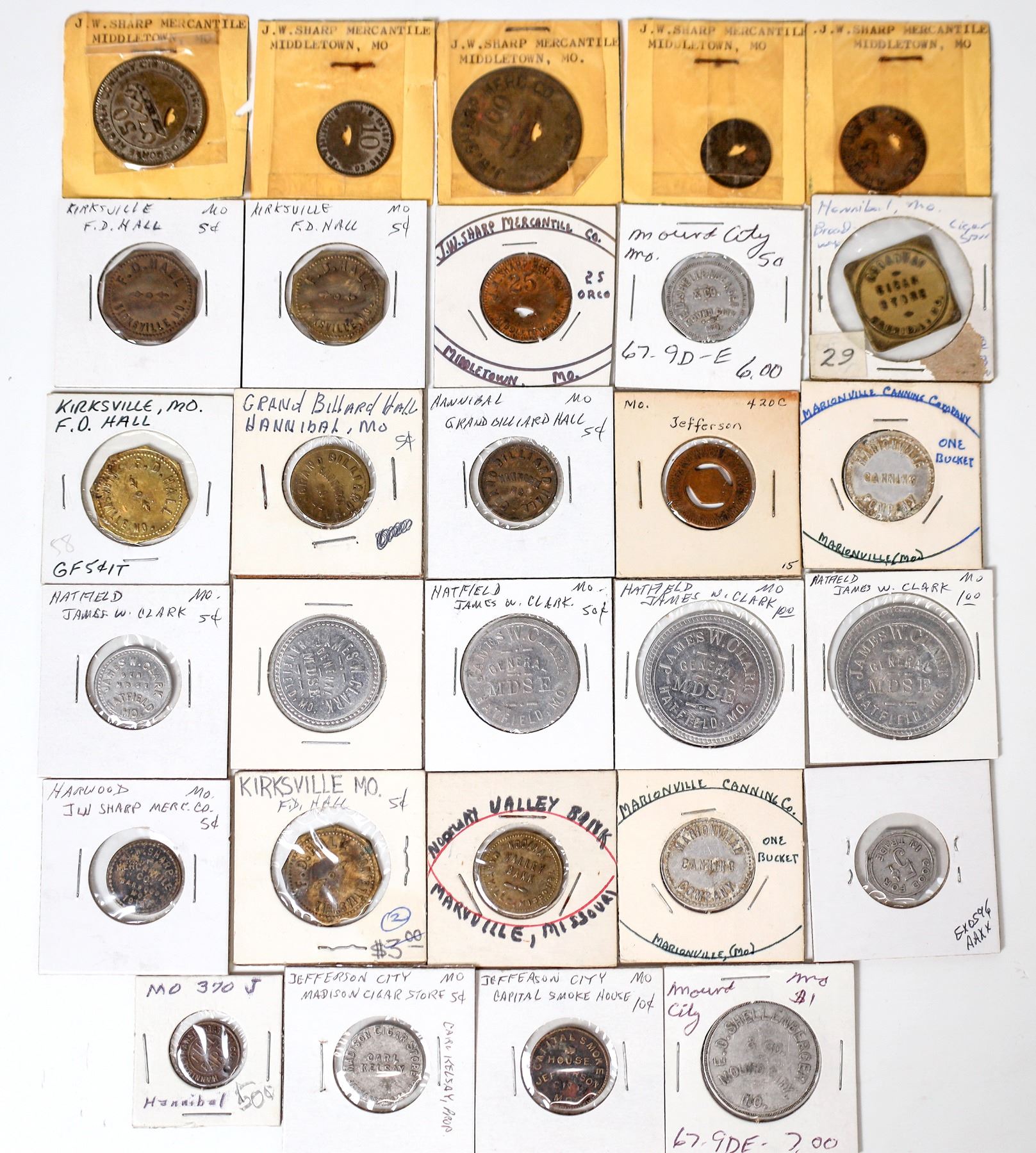 Lot of 29 tokens. Hannibal: Grand Billiard Hall (2); Broadway Cigar Store; transportation token. Harwood: J. W. Sharp Merc. Co. Hatfield: James W. Clark (5, various denominations). Jefferson City (3): Capital Smoke House; Madison Cigar Store; transportation token. Kahoka: Shaffers. Kirksville: F. D. Hall (4). Marionville: Marionville Canning co. (2). Maryville: Nodaway Valley Bank. Middletown: J. W. Sharp Mercantile (6). Mound City: E. D. Shellenberger (2: GF 50c & $1).