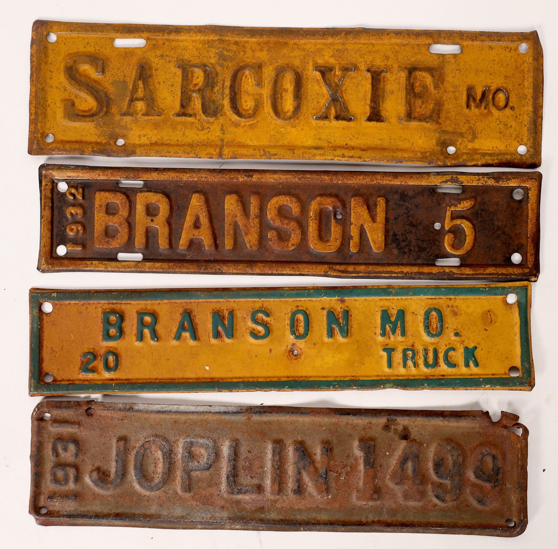 4 unusual about 3x12" licence plates. 1932 Branson 5, 1931 Joplin 1499, 20 Branson MO Truck, Sarcoxie Mo. Condition varies, please inspect. Missouri Bracken Estate