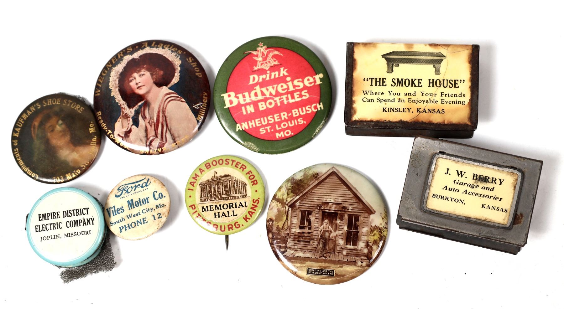 Lot of nine vintage advertising mirrors, buttons, etc. from businesses in Missouri and Kansas. These businesses include a shoe store, a power company, a smoke shop, car shops, etc. Various sizes, largest mirror is about 2 inches in diameter. Good condition, some rust.