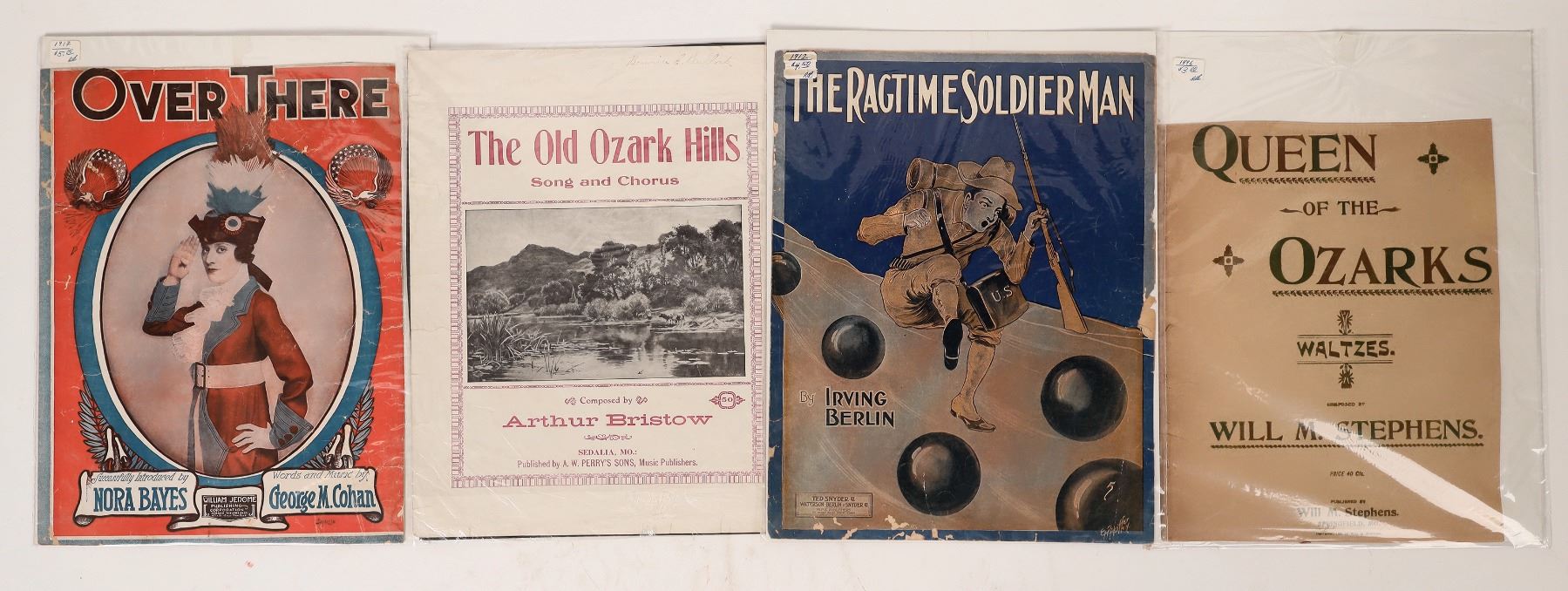 The Old Ozark Hills by Bristow, Queen of the Ozarks Waltzes by Stephens, The Ragtime Soldier Man by Berlin, Over There by Cohan. Gary Bracken Collection