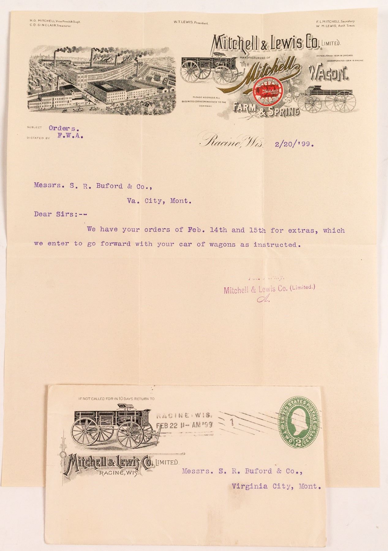 1899 letter and cover from the Mitchell & Lewis Wagon Co. (Racine, Wisconsin) sent to S.R. Buford & Co. in Virginia City, Montana. Re: order of extra parts to be included "with your car of wagons." Choice Western imagery! Beautifully detailed pictorials on the letter and envelope.