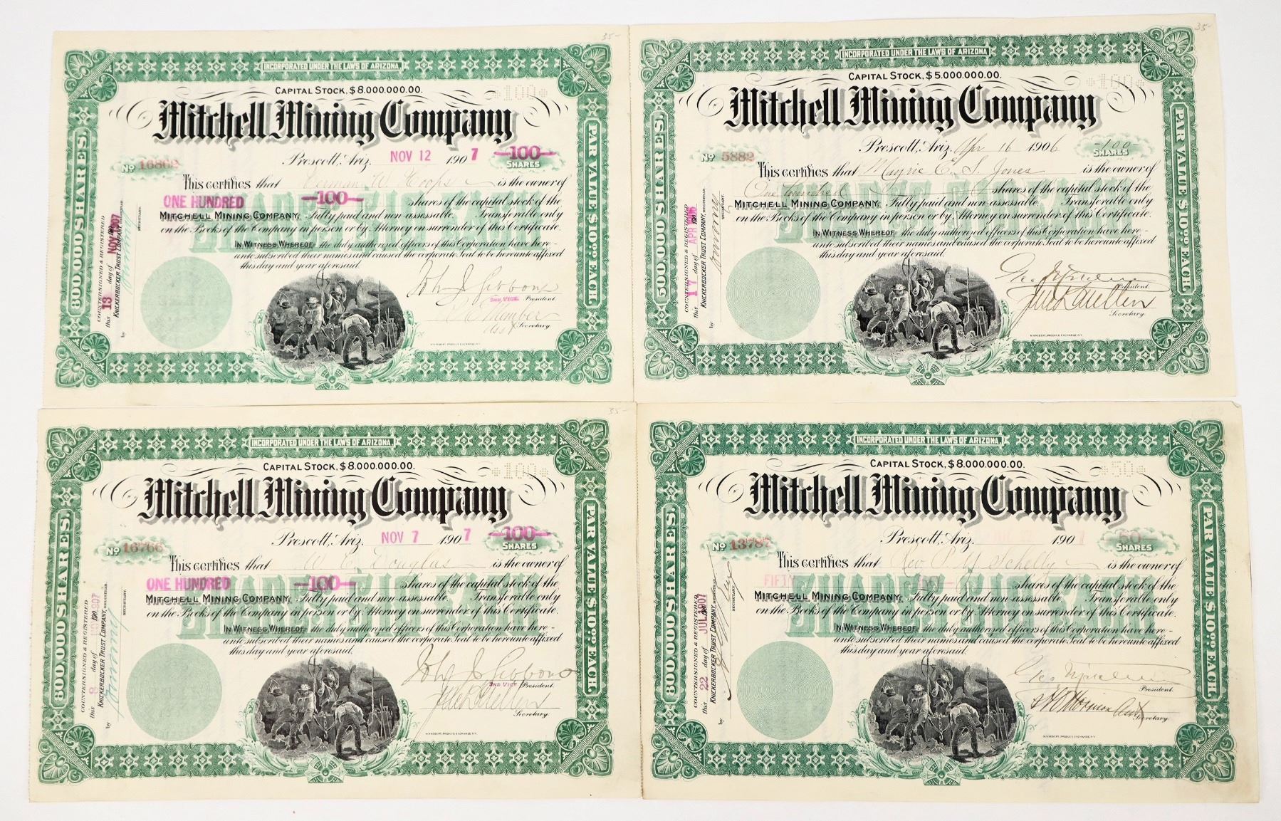 Lot of (4) stock certificates from the Mitchell Mining Company, Yavapai County Arizona. Great central mining vignette, embossed corporate seal. Signed by President and Secretary, countersigned by Knickerbocker Trust Co. Punch indicated shares amount on each. Good to very good condition, see photos.