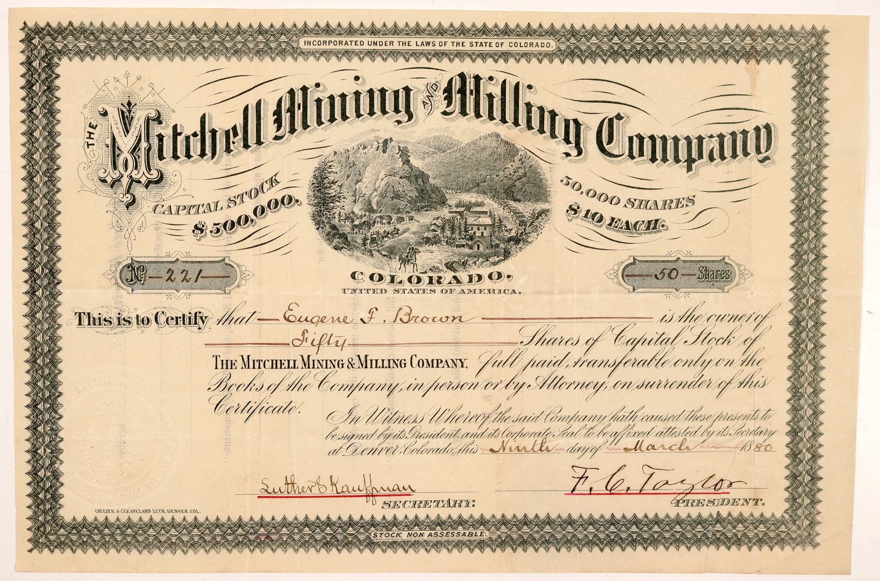 Inc. in Colorado. No. 221, issued for 50 shares to Eugene F. Brown on March 9th, 1880 in Denver. Signed by president FC Taylor and secretary Suther Kauffman. Not cancelled. Ornate black border and print, fancy title and mining vignette. Printed by Collier & Cleaveland, Denver. Folds and creases. 6.75 x 10" Not listed in Fossett or C&L. An article in E&MJ Vol. 30 (Dec. 1880) asks for an update on the status of the mine and gives its location as Gilpin County. No other info found. State: Colorado City: Gilpin County Date: 1880