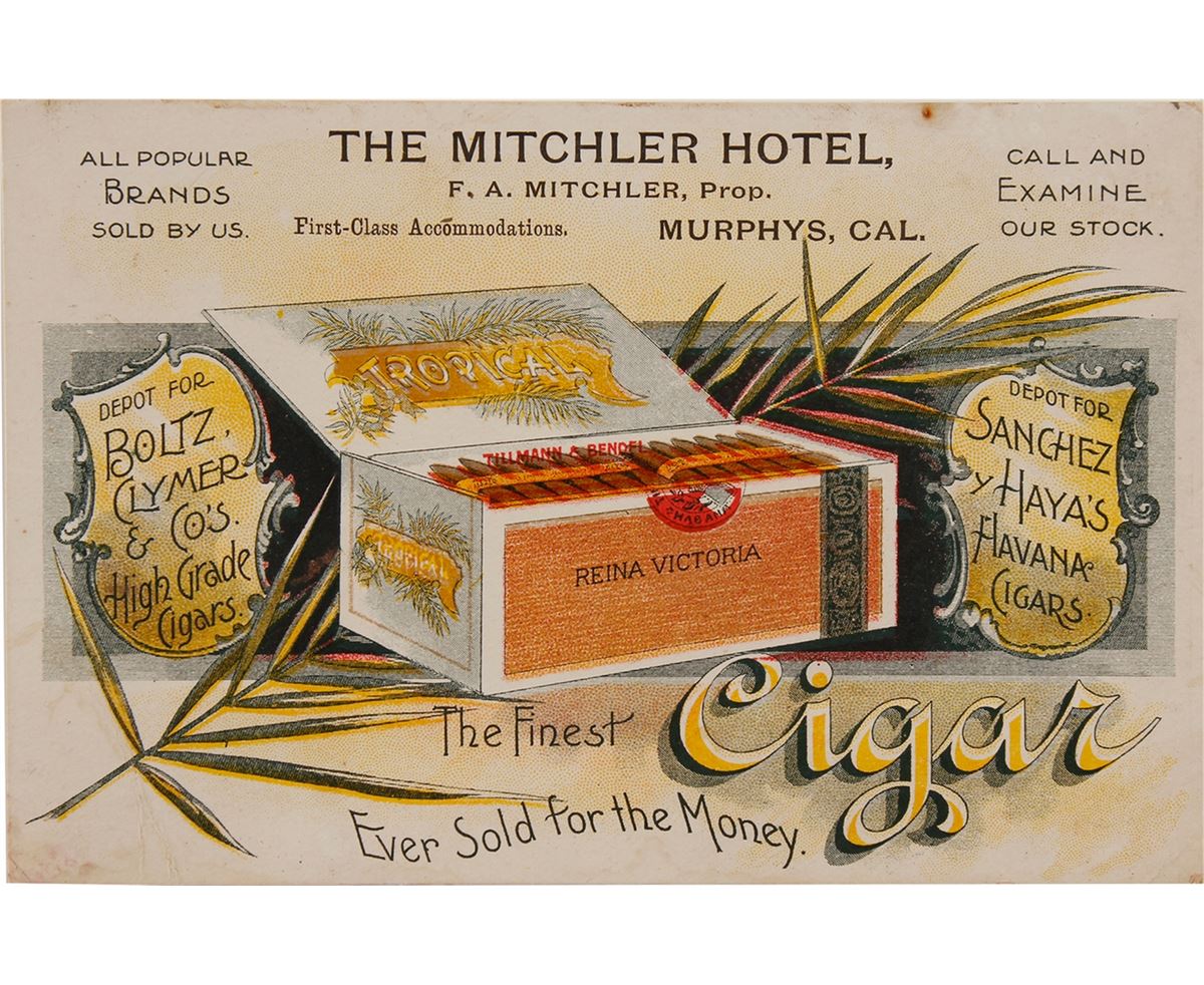 Business card for the Mitchler Hotel, first class accommodations. Highlights the cigars sold: Reina Victoria, Bolt Clymer, and Sanchez y Hayas Havana cigars. Very nice condition. The Murphys Hotel in Murphys, California is one of the oldest hotels still operating in California. First called the Sperry and Perry Hotel, it was opened by James L. Sperry and John Perry on August 20, 1856.[1] The town of Murphys was a popular stopping point along the stagecoach route from Milton to the Calaveras Big Trees. Thought to be fireproof due to its stone construction and iron shutters, the hotel was damaged in the fire of 1859 that destroyed most of the downtown area. However, it was quickly restored and reopened by spring of 1860. The new Sperry and Perry Hotel was considered one of the finest hotels outside of San Francisco, and was host to many famous people over the years. Copies of the original register show such signatures as Mark Twain, John Jacob Astor, Ulysses S. Grant, John Bidwell, Charles Bolles (alias Black Bart), Henry Ward Beecher, Horatio Alger, J.P. Morgan and Thomas Lipton. Renamed the Mitchler Hotel in 1882, and the Murphys Hotel in 1945.