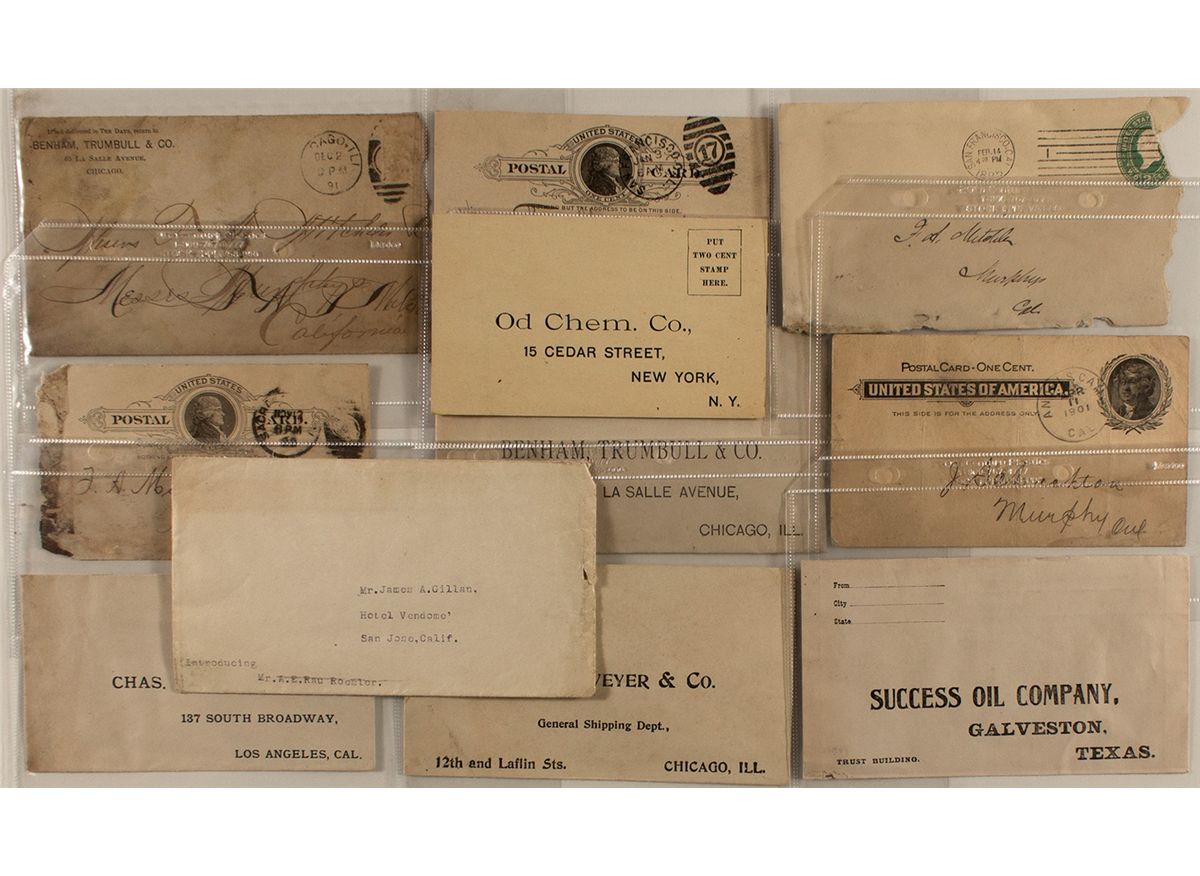 11 pieces: Angels Camp 1901 cancel on Wells Fargo postal, Charles Smith of Los Angeles unused return envelope, John Schweyer of Chicago unused return, 2 Benton Trumbull of Chicago (one unused return and one 1891 with strong Murphys cancel on back), Old Chemical of New York unused return, Success Oil of Galveston unused return, A. S. Fass of Sonora/San Francisco postal, Sacramento Steam Coffee and Spice Mills of Sacramento postal.City: County: State: CADate: