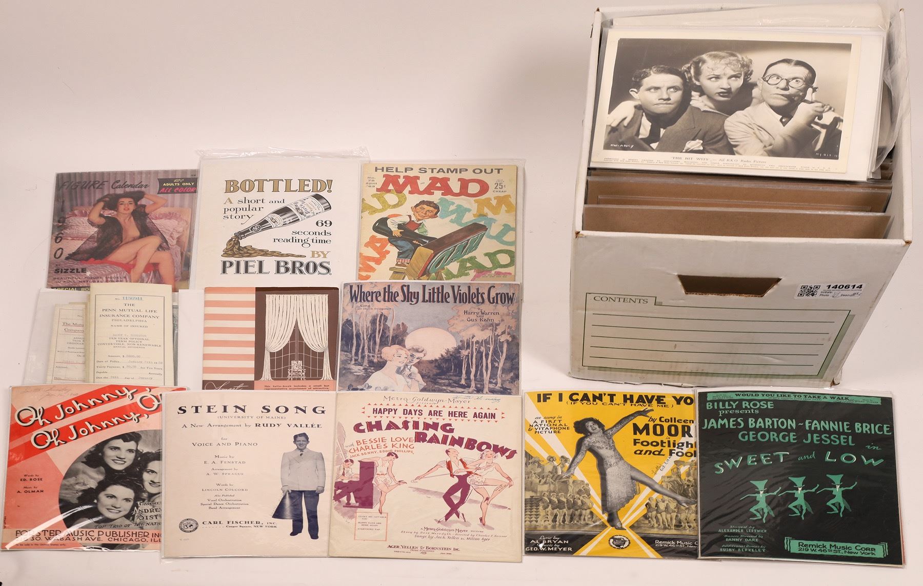 A REAL mixed bag. This is an assortment of banker receipts, bill heads, adult only magazines, and advertisements for various products. Even an 8"x 10" publicity photo with Bert Wheeler, Robert Woolsey and Betty Grable. This will be a real scavenger hunt for the buyer. A REAL grab-bag, with a ton of collectables and sellable items. Please see photos for more detail and condition.