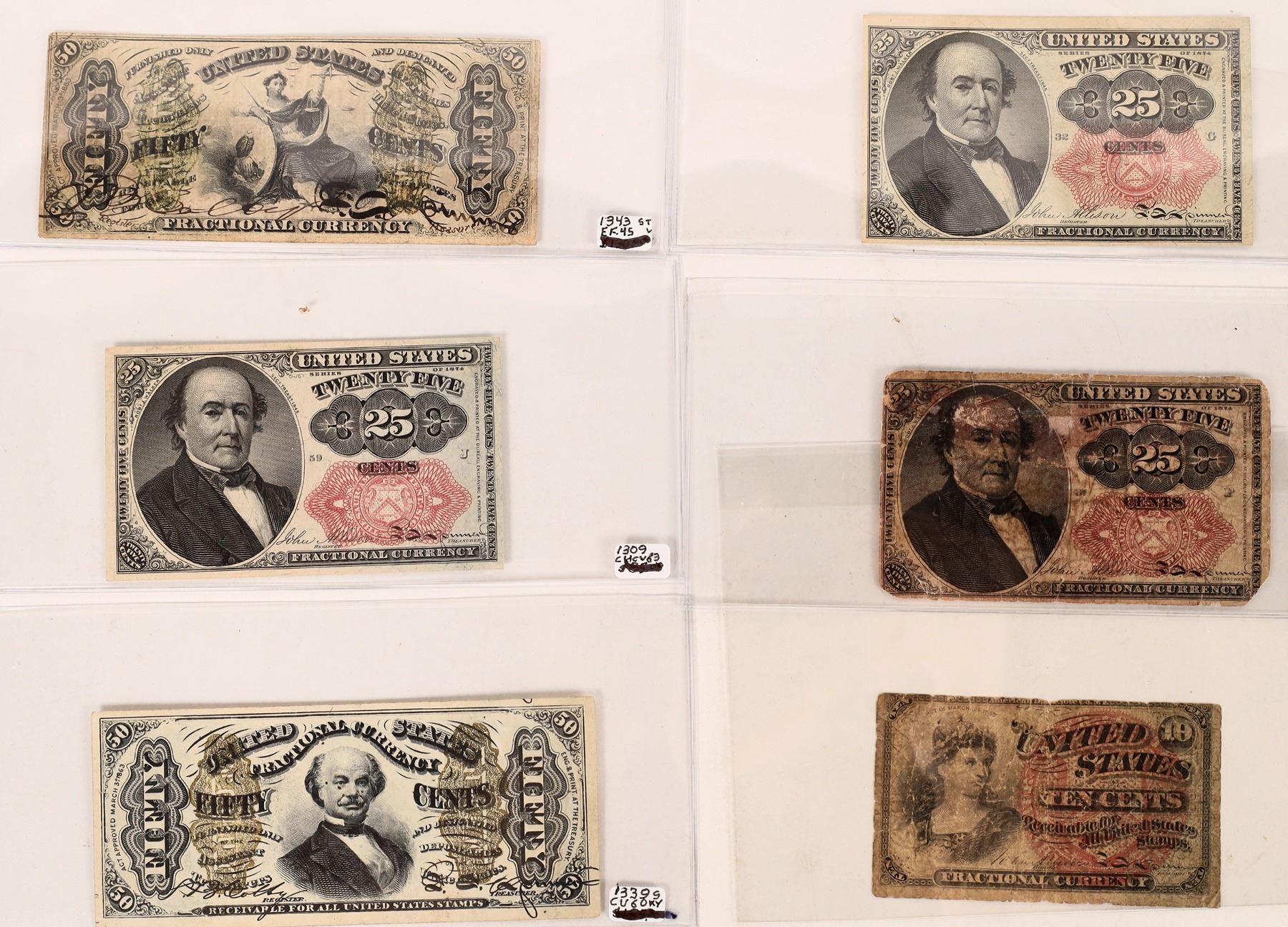 Six pieces of fractional currency: 1) Crisp uncirculated fifty cents FR #1339; 2) EF 45 FR # 1343; 3) FR#1309 choice EF; 4) FR#1308, AG 3; 5) FR#1308 crisp uncirculated; 6) ten cent P#115, AG.