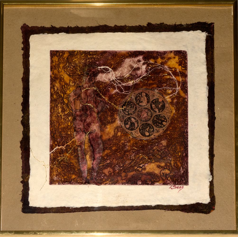 15 x15" frame by Louise Evans. Handmade paper and chine colle and ink drawing over etching print with white and gold threads.