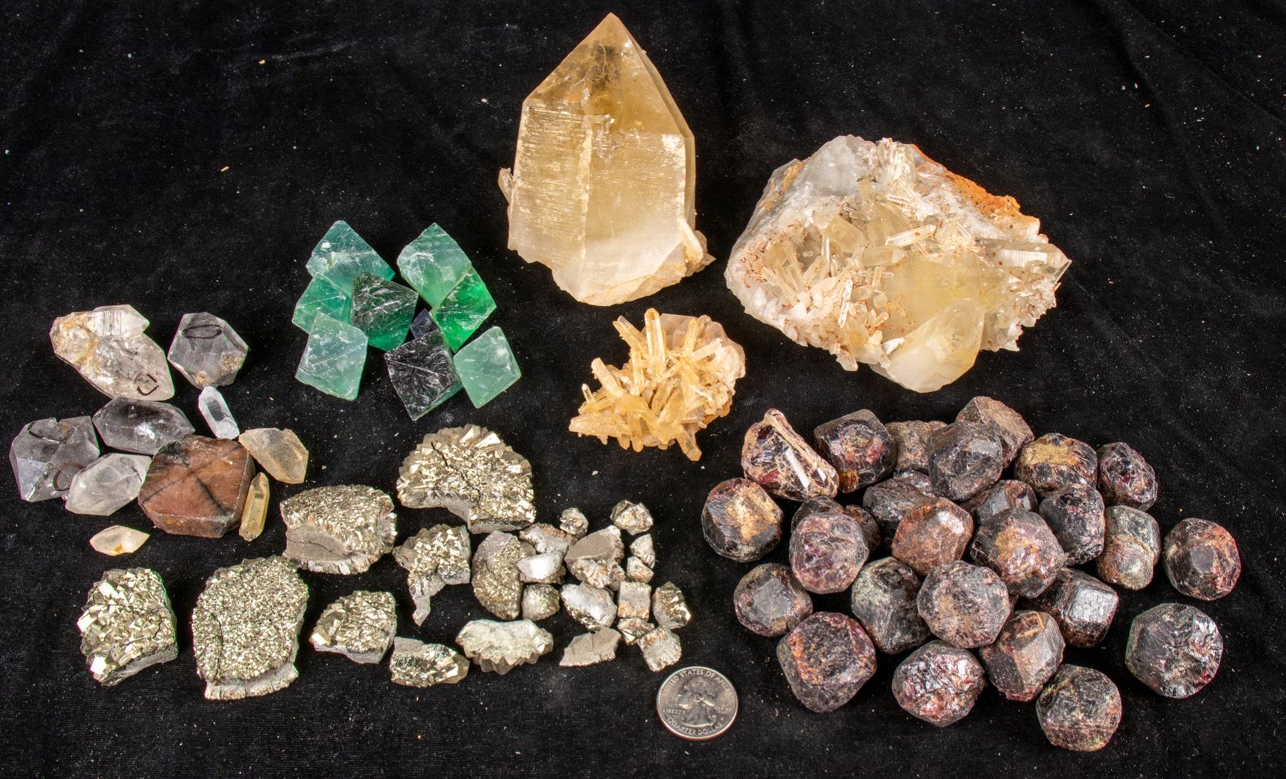 Variety of crystals: Blue green fluorite octahedra, single quartz, quartz spray, pyrite, garnet singles, double terminated quartz, andalusite State: City: Date: Provenance: Chunlin Zhu Collection