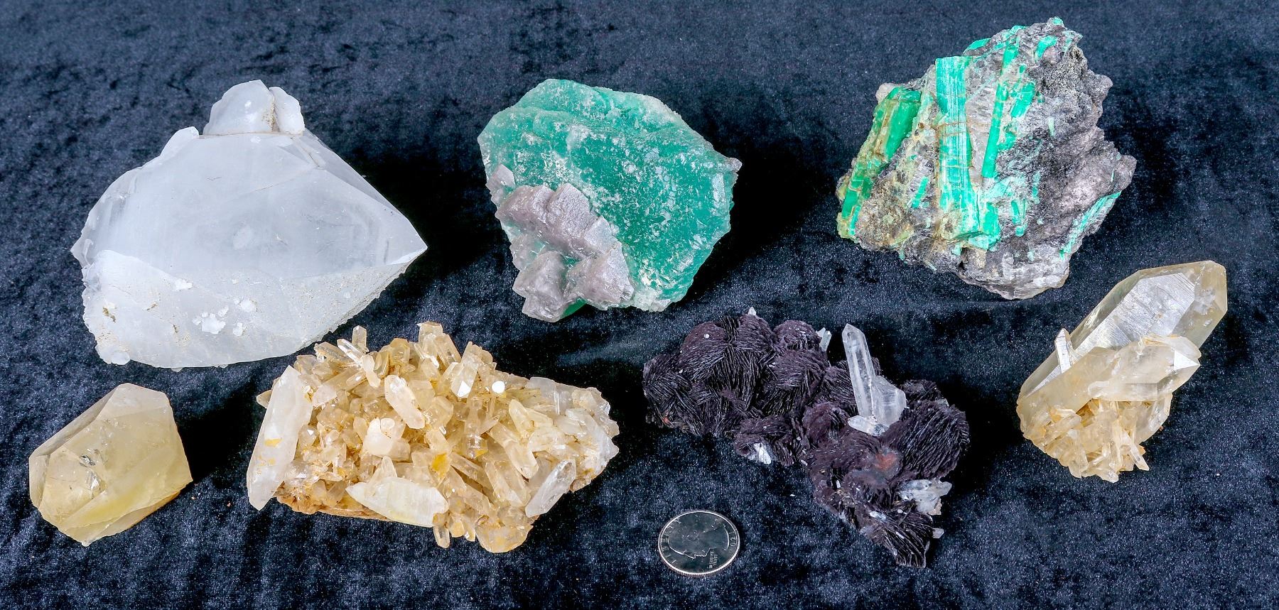 Lot of 7 specimens measuring from 2-4" in size includes quartz, fluorite, and a real beauty - beryl variation emerald on quartz China Chunlin Zhu Collection