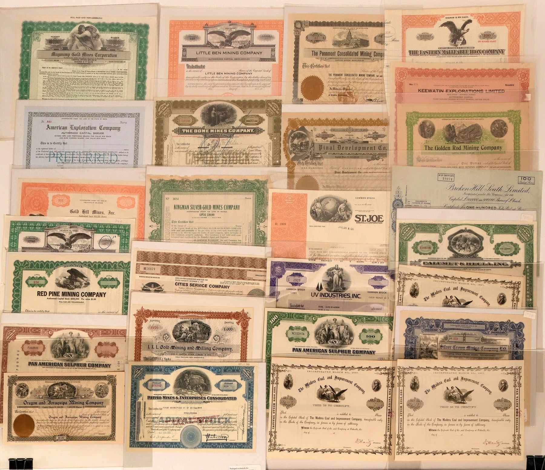 A nice group of 25 mining stock certificates, all in very good condition. Some are canceled some, unused. Companies include Little Ben Mining Company Montana. Pennmont Consolidated Pennsylvania, Pinal Development Arizona and many more. An affordable collection.