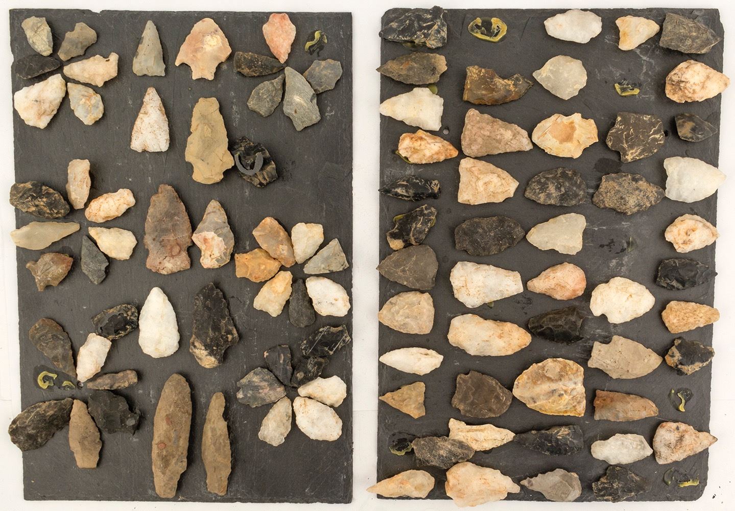 Bradley collection. Arrowheads and projectile points collected along the Chattahoochee River near Roswell Georgia. Two thin black slate plates with projectile points adhered by Mrs. Bradley. These projectile points number approximately 150. They include Flint or chert, obsidian, quartz, and some metamorphic rock. The general size is about 1 1/2 to 2 inches. This is a nice varied collection. Date: Location: Georgia HWAC # 51061