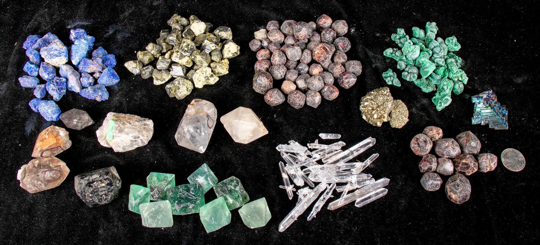Mini crystals including single clear quartz, garnet, epidote, malachite, azurite, tourmaline, pyrite, bismuth, fluorite, and 3/4" beryl China Chunlin Zhu Collection
