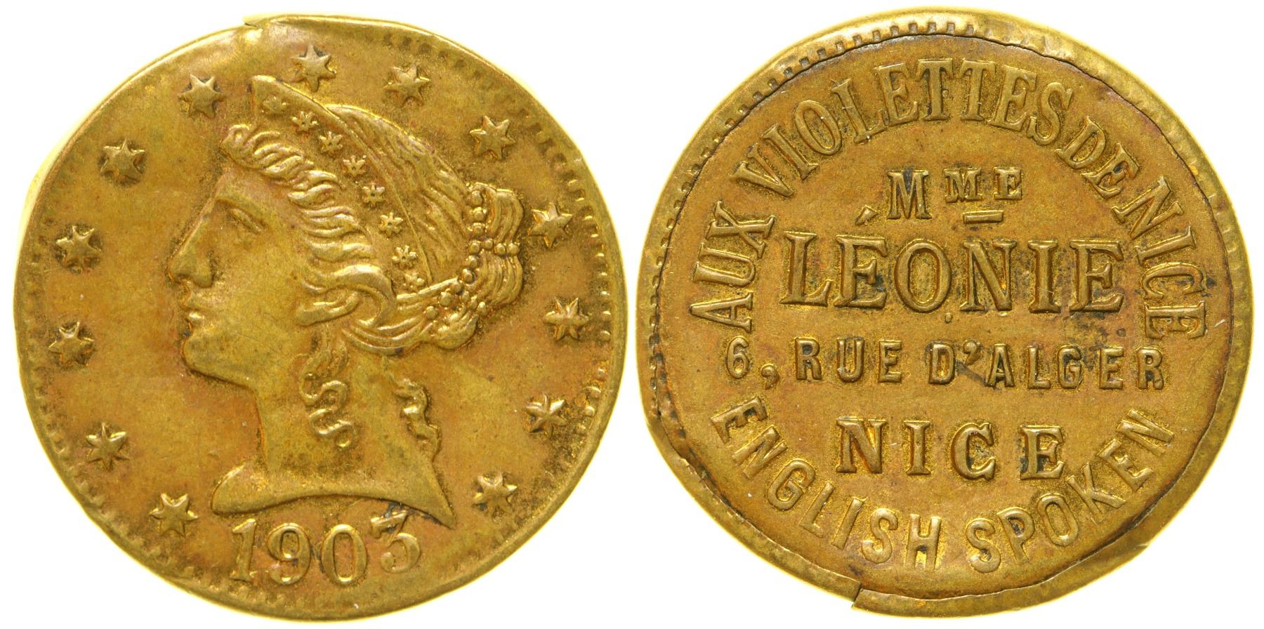 Obv.: Aux Violettes De Nice / Mme. Leonie / 6 Rue D'Alger / Nice / English Spoken; Rev.: quarter eagle, coronet head, 1903. Br. rd., 21.5 mm.