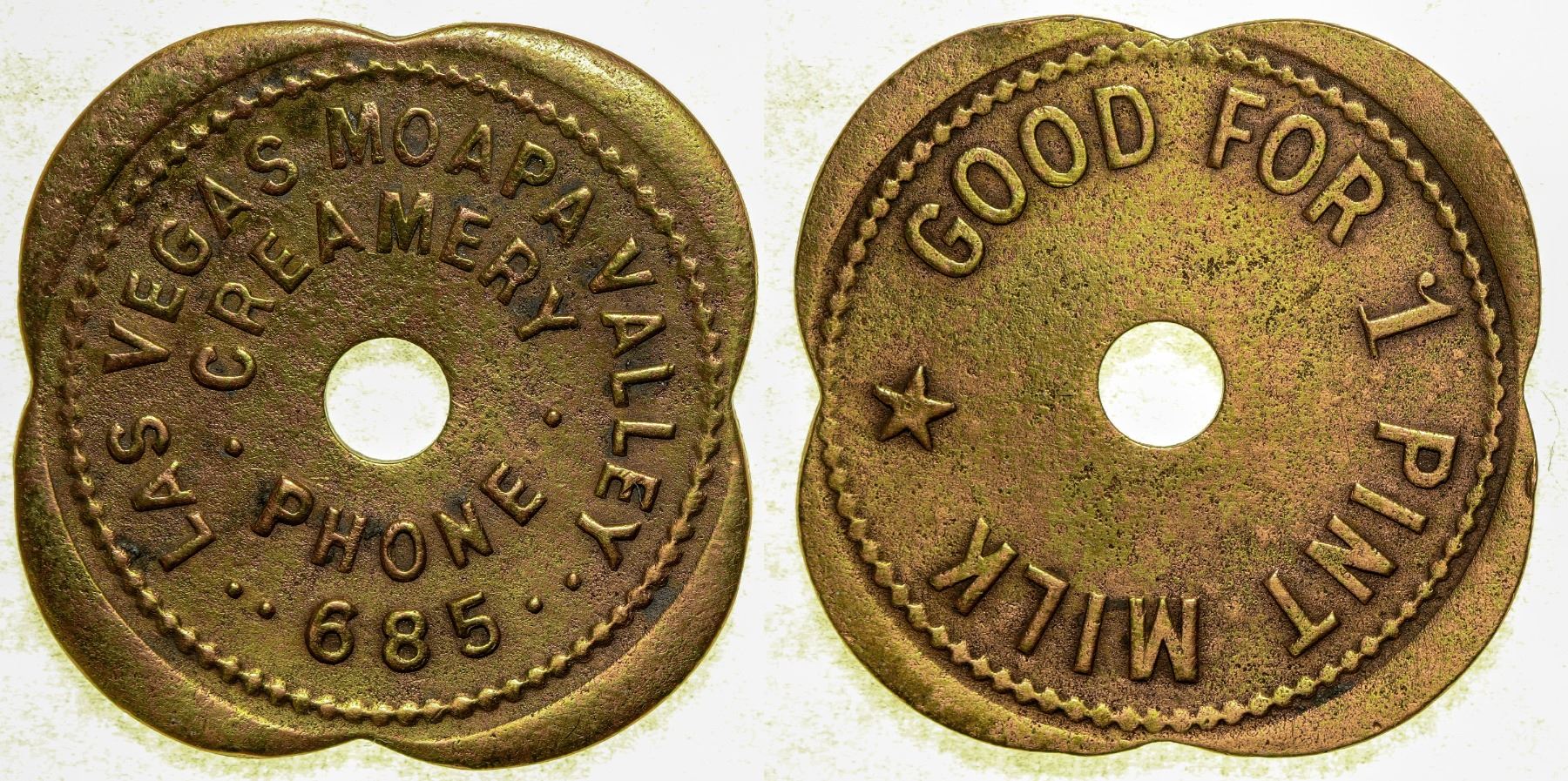Obv.: Las Vegas Moapa Valley / Creamery / Phone /685; Rev.: Good For 1 Pint Milk. Center hole, 24 mm.