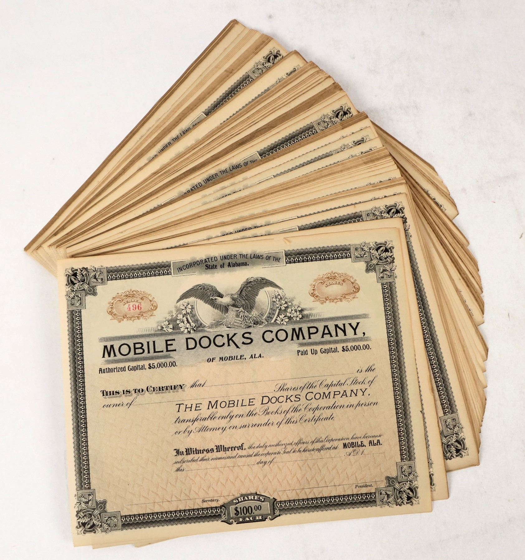 Group of approx. 200 unissued stock certificates from the Mobile Docks Company of Mobile, Alabama. Uncancelled. Black ink w/ brown underprint. 10.25"x8.25" certs, generally good condition with some toning; see photos.
