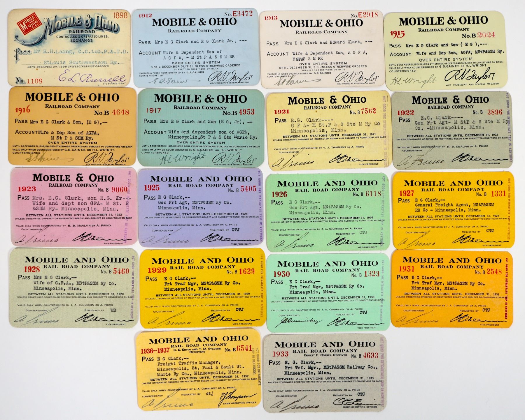 Group of 18 railroad passes from the Mobile & Ohio Railroad Company. Passes date from the early 1900s; see photos for specific years and additional detail.