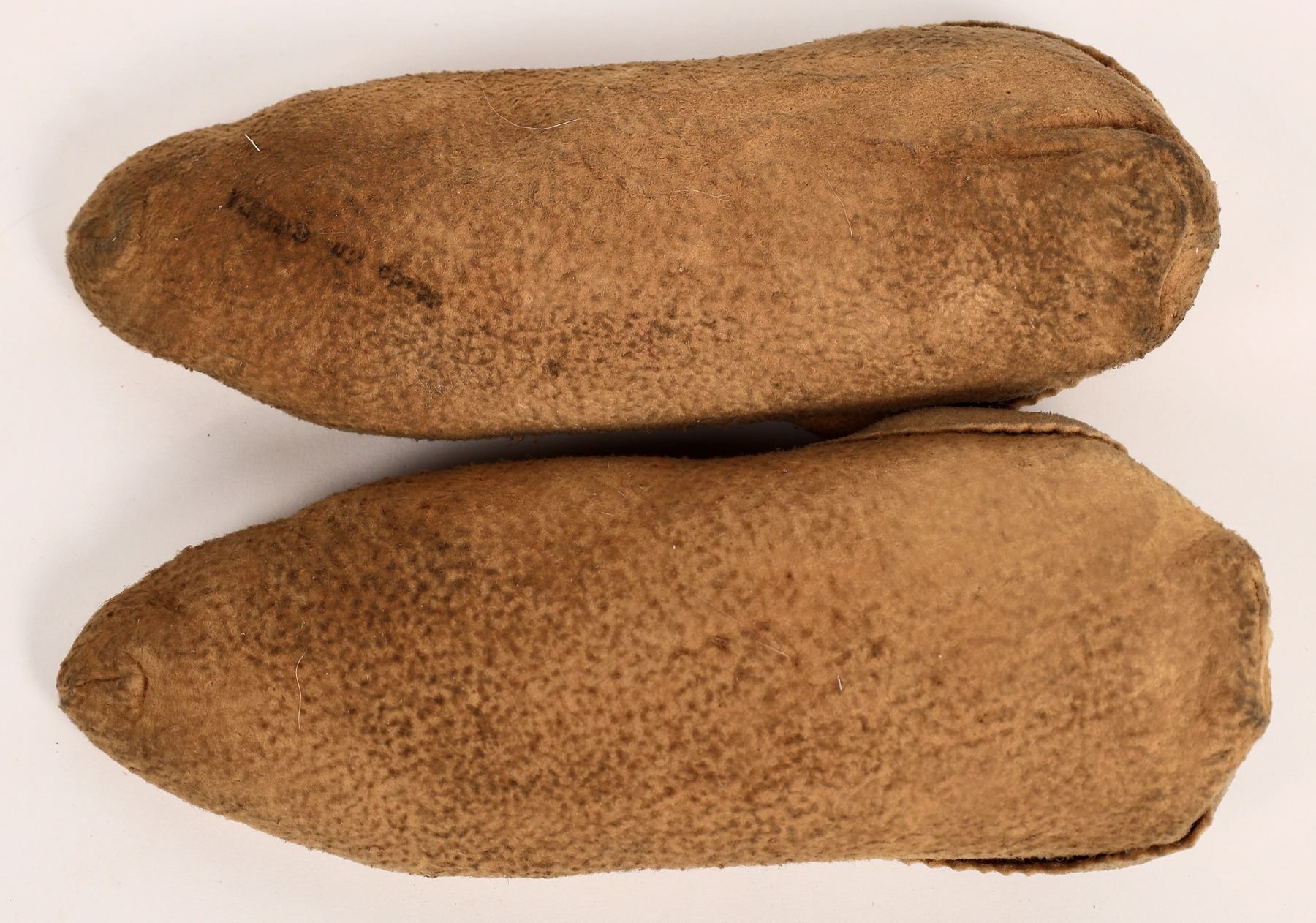 Beaded moosehide mocassins made in a one-piece, pointed-toe construction with appliqued beadwork pattern in white, yellow, pink, and red beads surrounded by pink-dyed, woven porcupine quills. Though apparently never worn, the quillwork has degraded with age. Unfinished buckskin edges appear to have been cut with a pinking shear. Possibly from a tribe in the Ohio River Valley area.