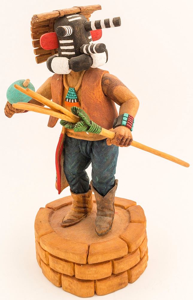 Mocking Kachina, Leonard Selestewa. 10.75" x 6" x 8". Great piece in great condition, wears cowboy boots! Leonard is a traditional Hopi farmer from the village of Moenkopi on the western border of the reservation, near Tuba City, Arizona. He is also a water-rights activist but manages to find time for his carvings when he is not busy. Date: Location: Hopi, Arizona HWAC # 49321