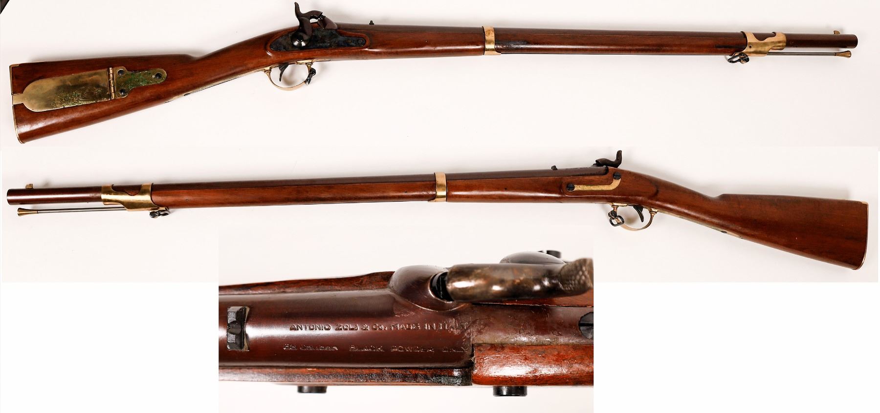 This is a NIB Model 1841 "Mississippi rifle" made by Antonio Zoli and imported by Navy Arms S/N 26573. This is a reproduction black powder rifle of an 1841 pattern rifle made at the Harpers Ferry Arsenal. It got the nickname "Mississippi" rifle after Jefferson Davis outfitted his Mississippi volunteers with them for the Mexican-American War. This one is .58 cal. with a 33.5 in. barrel and is 49 in. overall length. The gun is in its original box, shipping container, and cosmoline coated plastic bag, NIB ! It even includes the warranty papers written in Italian. This gun has not been fired and no attempt has been made to do so. No sales to New York City, New Jersey, California, and Hawaii. This is a non-FFL reproduction gun; additional shipping charges may apply. C. 1978.