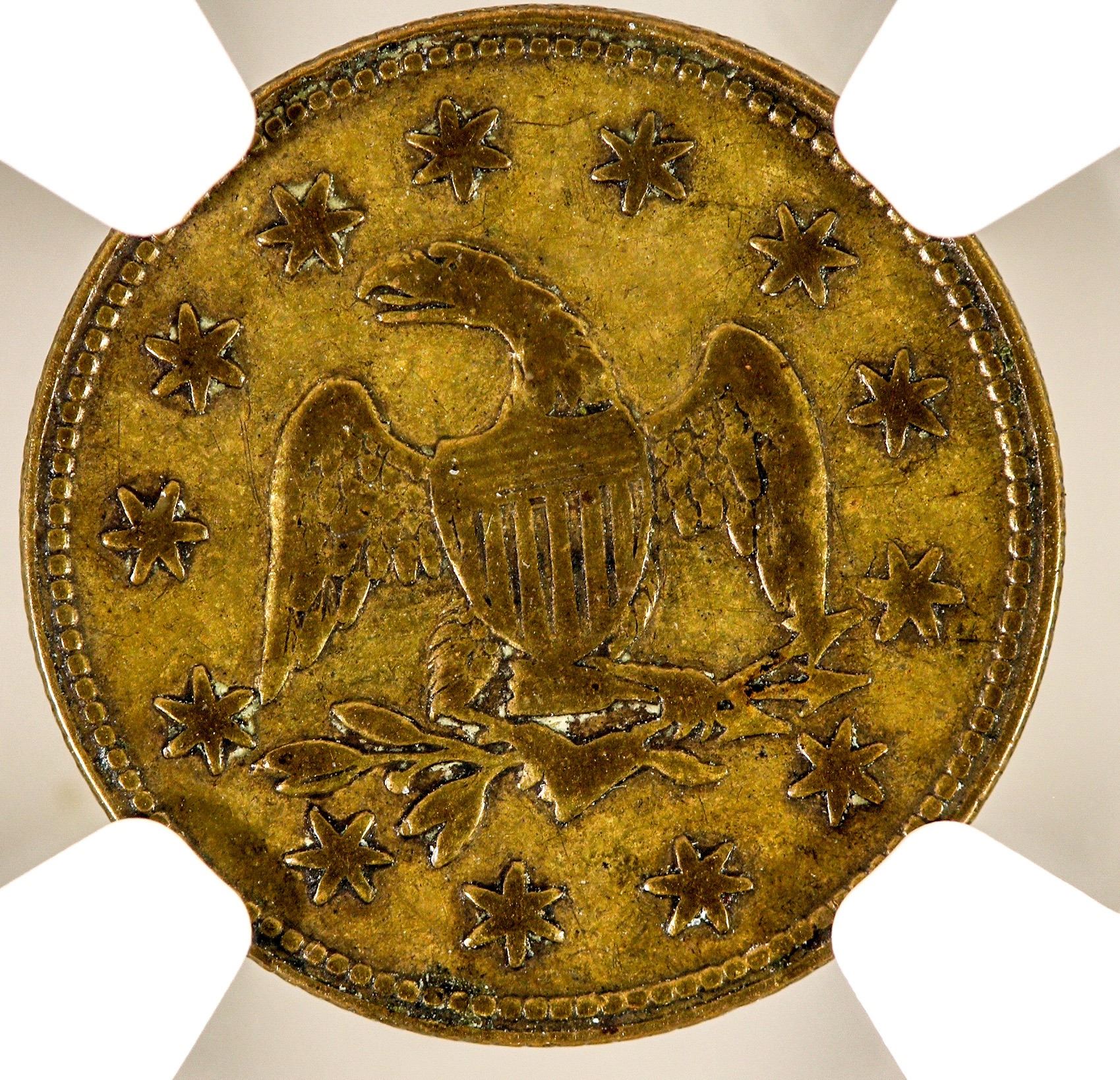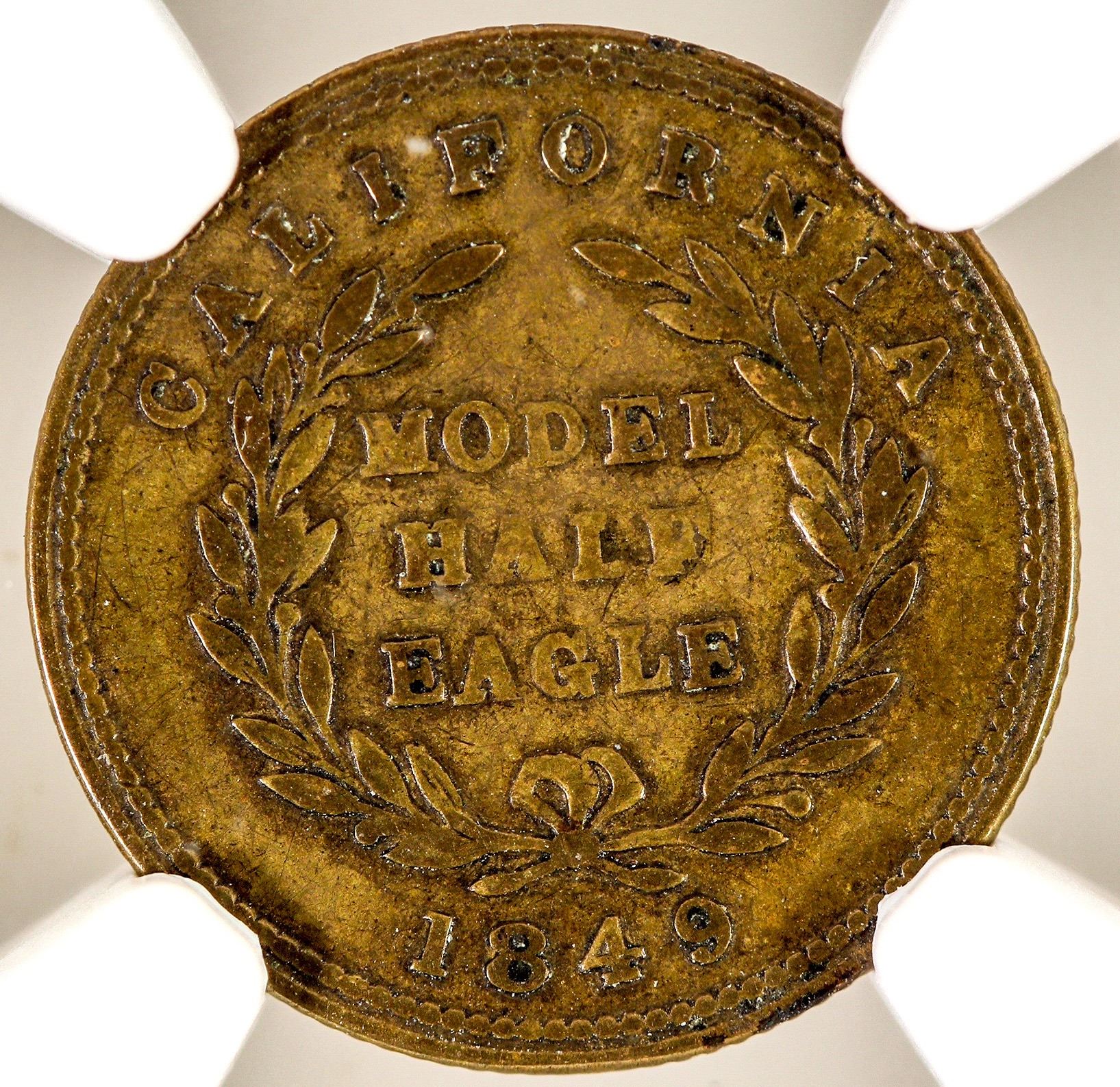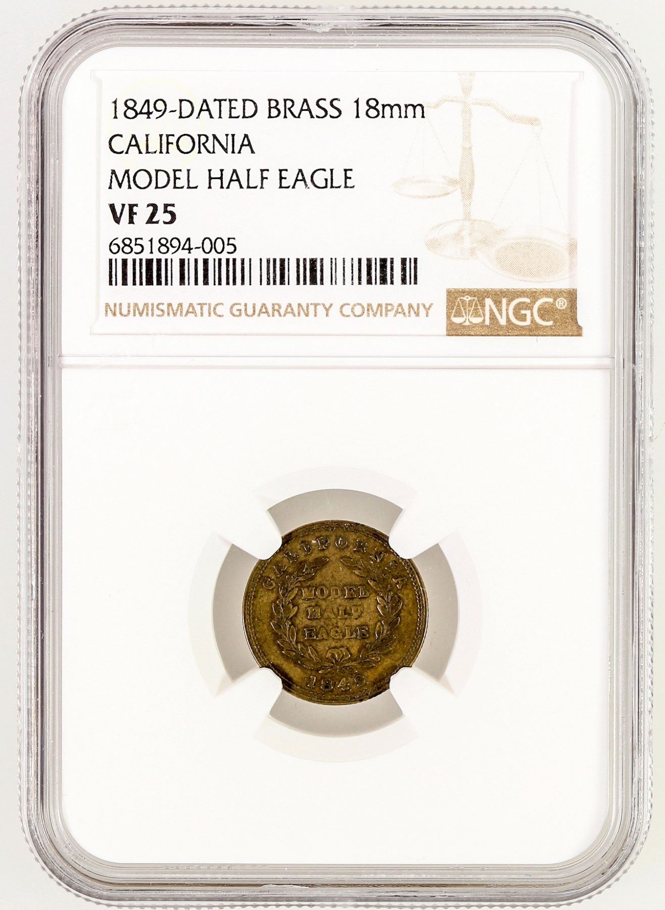 NGC certified VF 25, extremely rare. 1849 dated brass, 18 mm. California / Model / Half / Eagle.