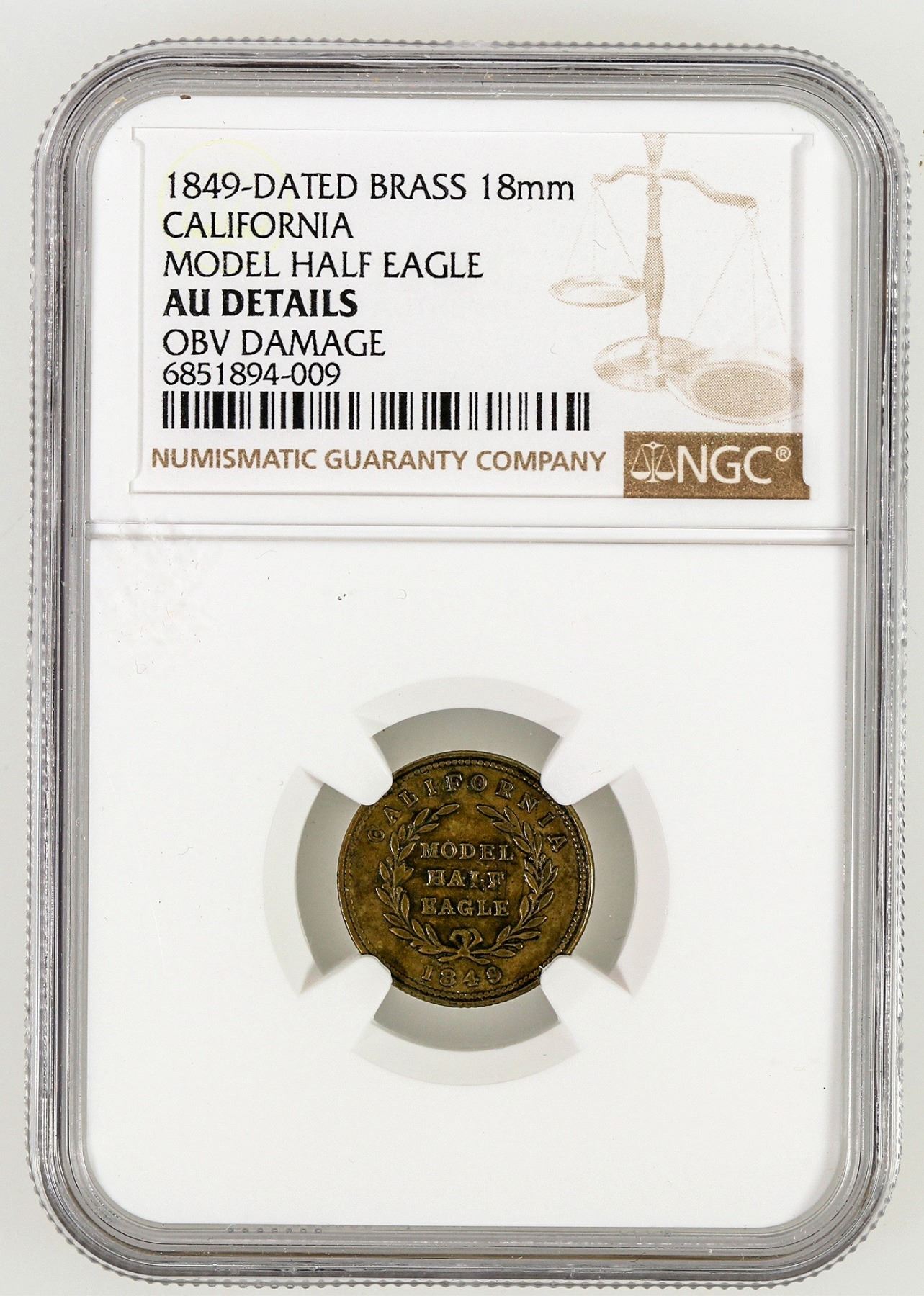 Very rare $1 gold piece size counter. Graded by NGC AU Details, obverse damage.(we don't see the damage). Brass, 18 mm.