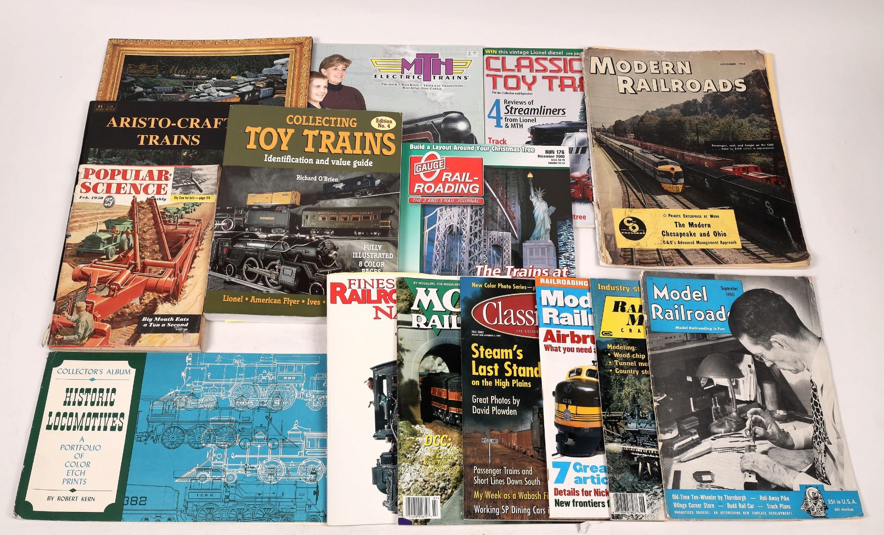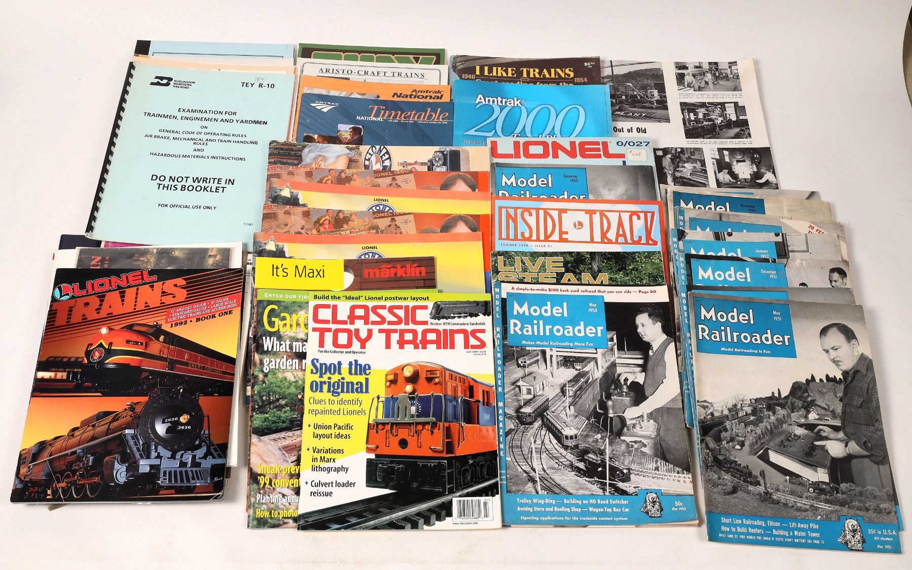 About 30 model railroad publication including Model Railroad c. 1950-53, 7 modern Lionel catalogs, various modern railroad ephemera items including official trainmen manuals.