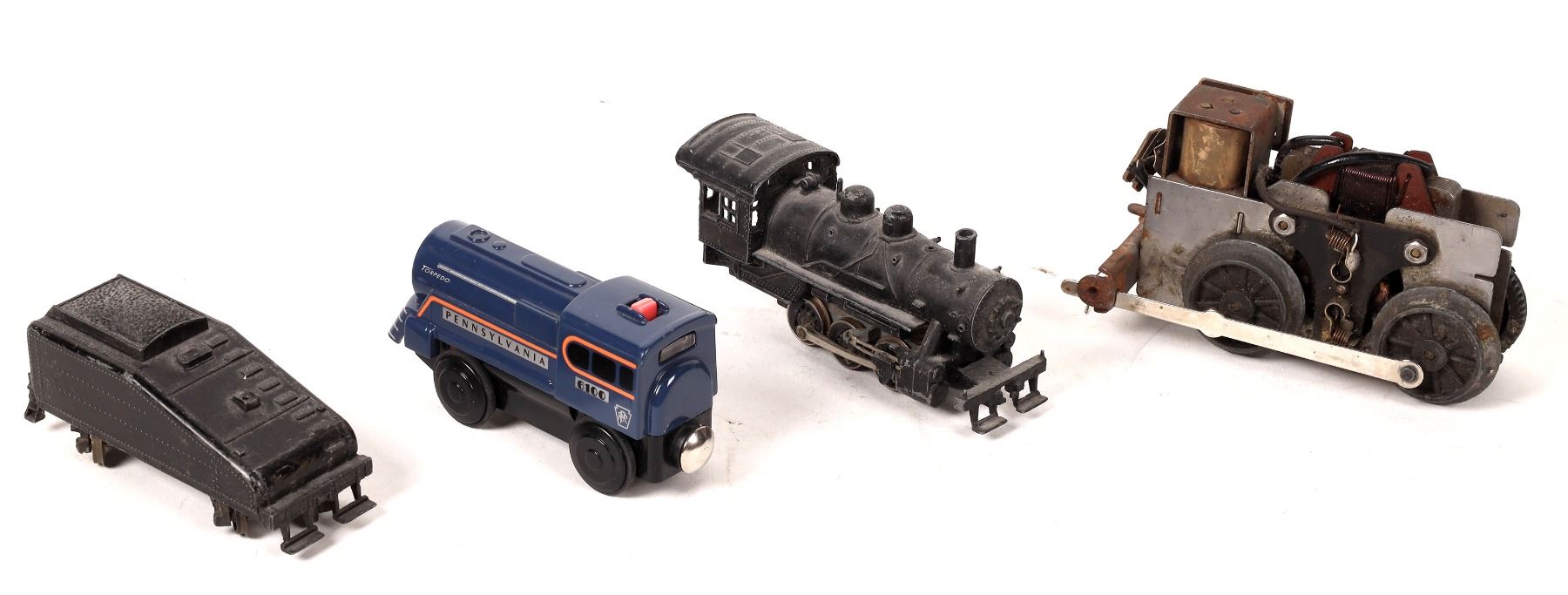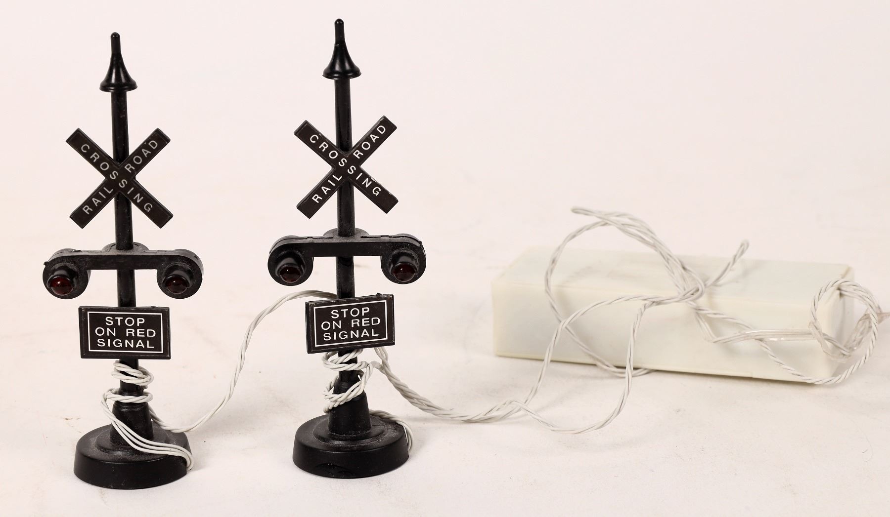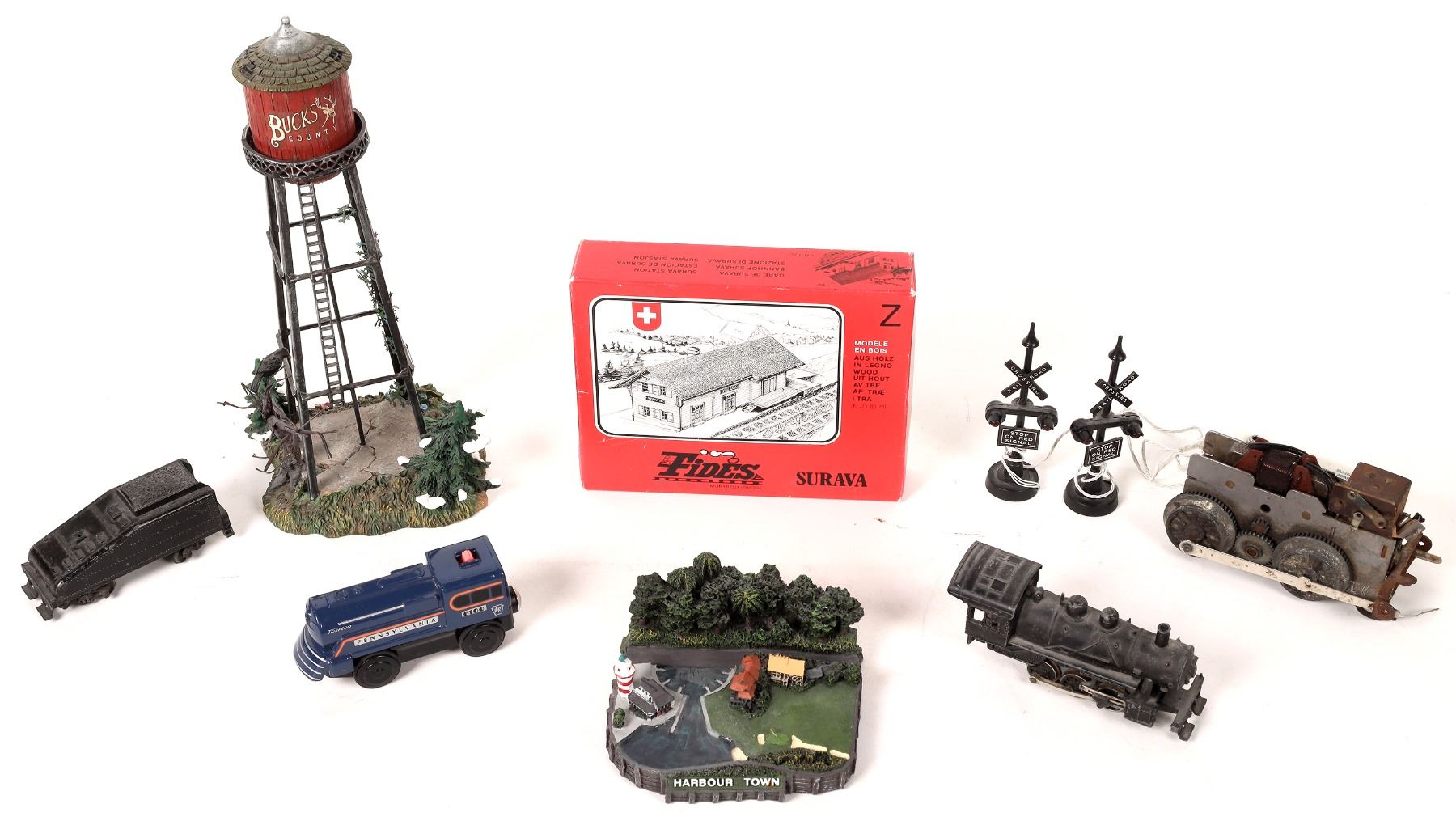 Small model railroad items. 10' Buck County water tower. Surava station, NIB. Mantua small locomotive and tender. Pair of wired signals. Harbour town, molded, 4x4". See photo.