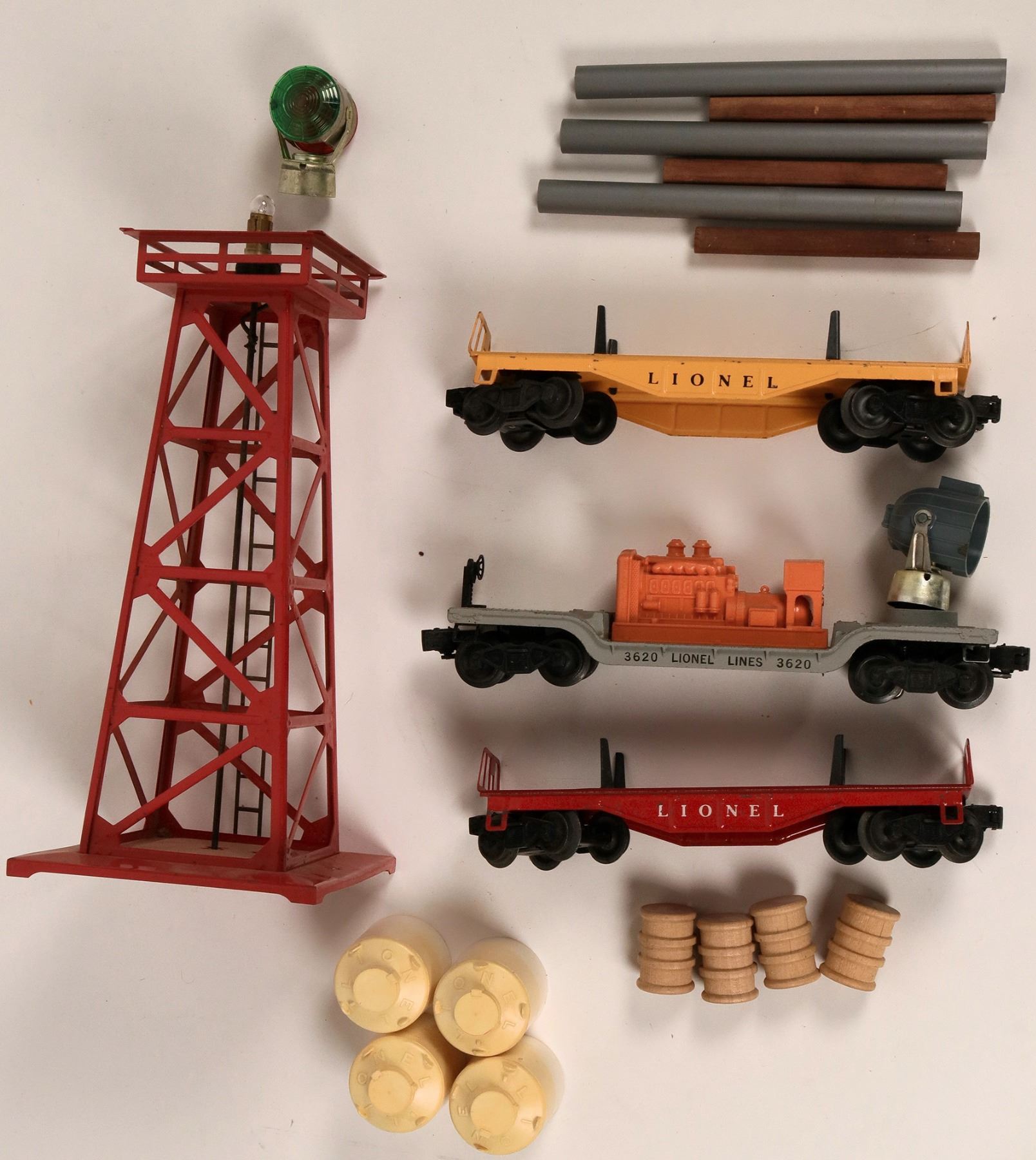 Lot of 4. 1. Rotating beacon #494 in original box, was not tested, but appears in great and clean condition. 2. Flat log/pipe car w/logs. Pipe. Red and Black , Knuckle couplers C-& condition, no box. . 3. Searchlight car #3620 w/ mounted generator, knuckle couplers. Tested in working condition in box. 4. Flat log car, yellow in C-7 w/knuckle couplers. In box. All items are in Lionel Loco train box.