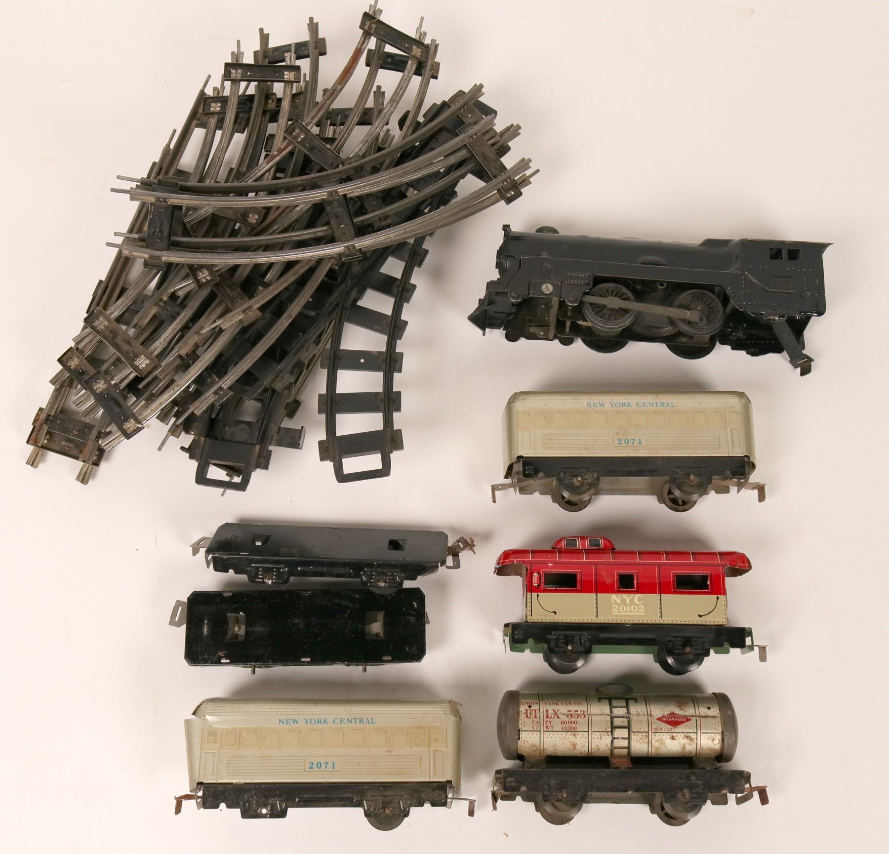 Lot of 15 pieces. Post War era MARX wind up .027 gauge train. Locomotive/no tender w/ 2 passenger, tank car, 2 flat cars and caboose. Track includes: 10 curve, 6 straight and 2 switches marked New York Central. One passenger has damage. L Remainder are in good condition. Loco was tested, winds up and runs but key is missing it’s overall cosmetic appearance is very good. MARX acquired Joy Trains in 1934. It was never their goal to compete with Lionel or American Flyer. Just to make the best toy trains at the lowest prices. Marx operated from 1934-1972 when it was sold to Quaker Oats. It’s last big toys were the Rock ‘Um Sock ‘Um Robots and The Big Wheel pedal toy.