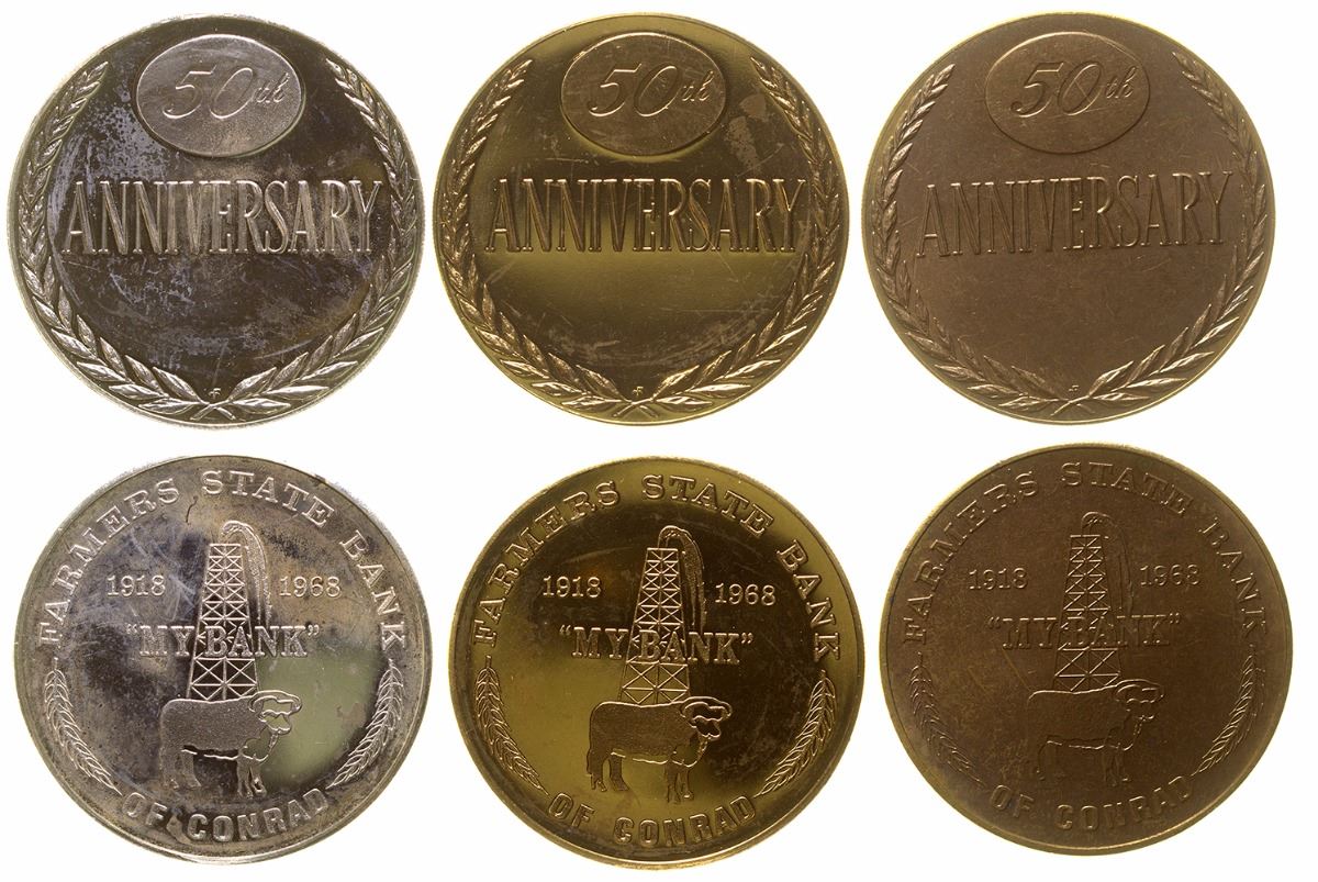 3 tokens: Farmers State Bank / 1918-1968 / "My Bank" / Of Conrad // 50th / Anniversary. State: Montana City: Conrad Date: FHWAC#: 41530