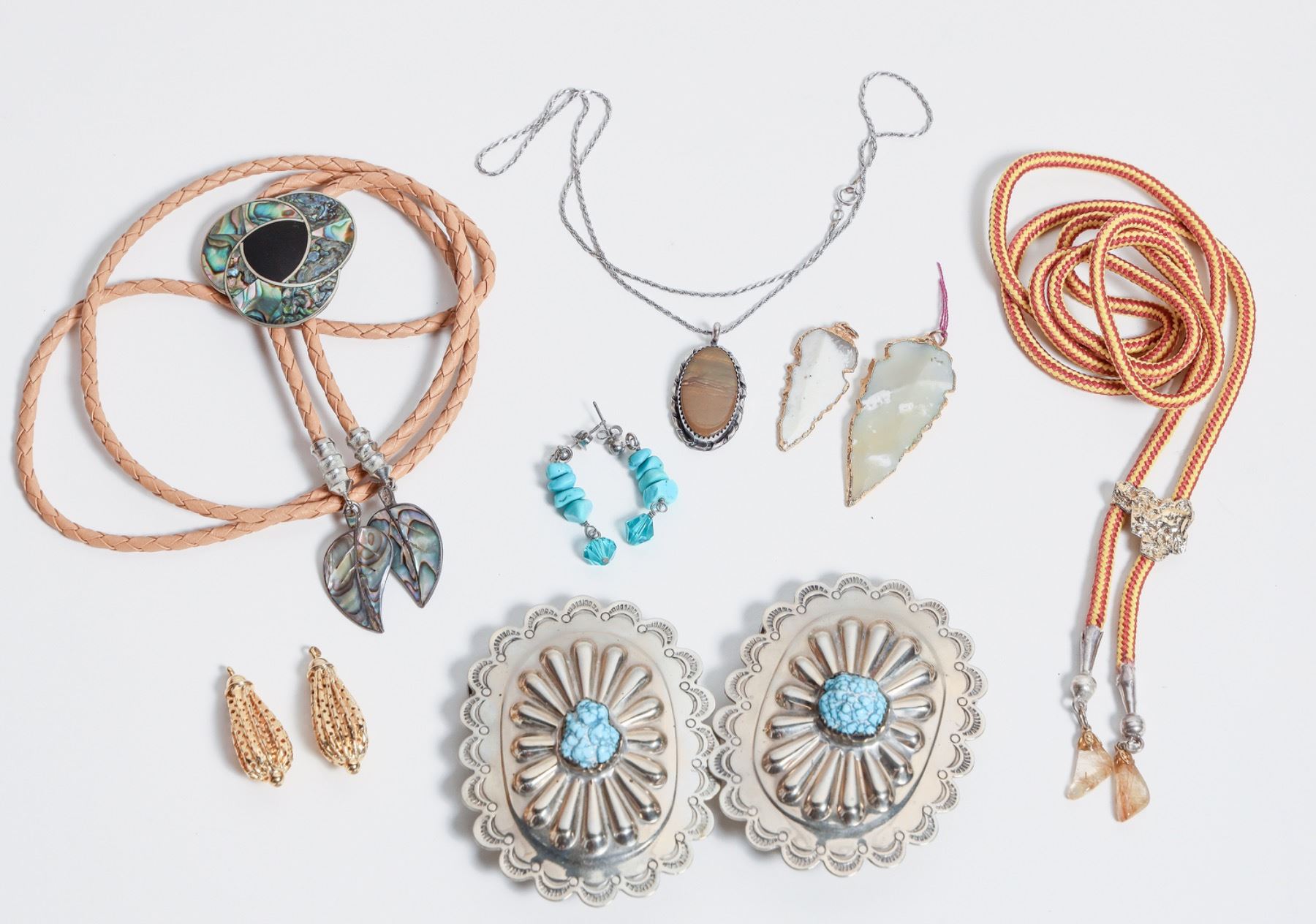Two belt buckles with turquoise; 2 bolos; pair of turquoise ear rings; stone pendant; pair arrowhead earrings; pair gold pine cone ear rings.