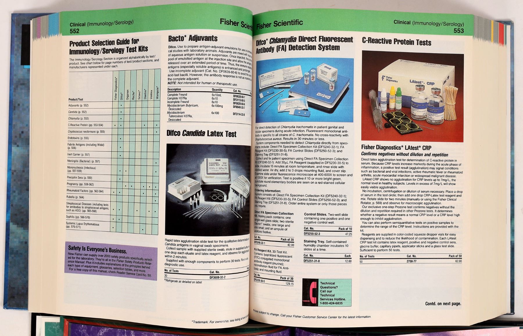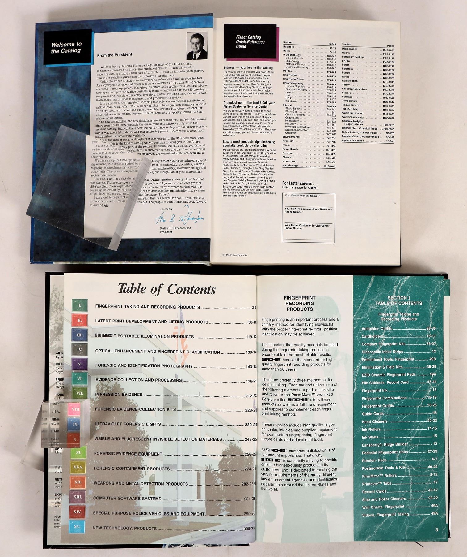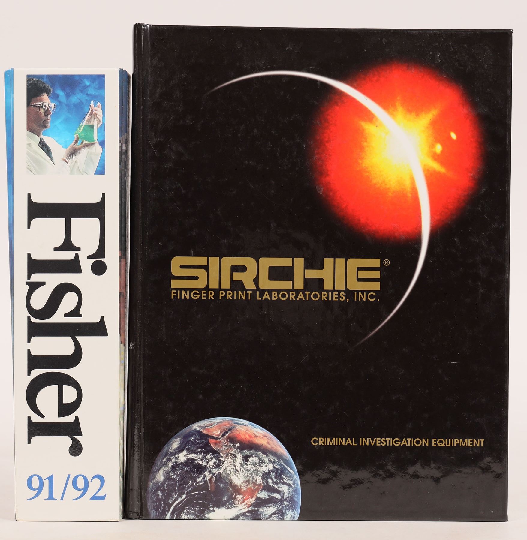 Two modern hardback catalogs -scientific/medical and criminal investigation, c1990-2000. Includes: "The Fisher Catalog," 91/92 edition, copyright 1990, Fisher Scientific, about 2000 pp. including index; and Sirchie Finger Print Laboratories, Inc. Criminal Investigation Equipment, copyright 2000, 335 pp. Please see photo(s) for more details.