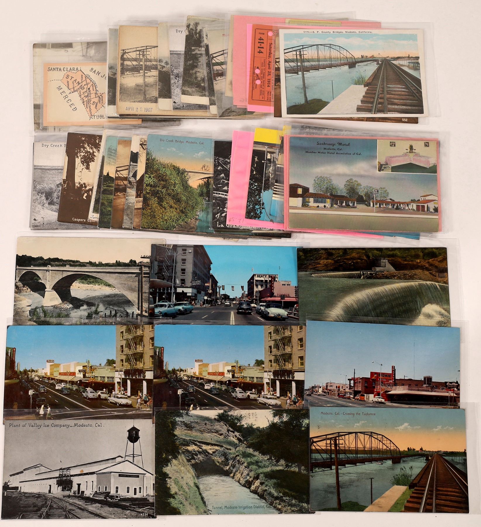 A nice sample of 45 postcards highlighting the California town of Modesto and its surrounding landmarks. railroad bridges, dams and Cooper's Lake are just part of the collection that also includes downtown and school images. There is also a punched Southern Pacific ticket from Modesto to San Francisco and more. Please see photos for more detail and condition.