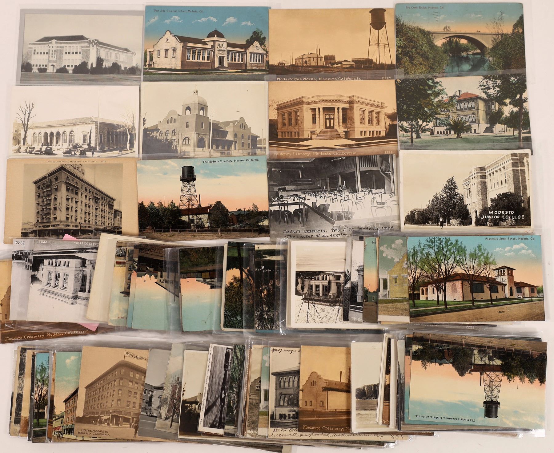 A nice array of 80 of RPC's and other postcards showing images of the Central California town of Modesto. Cards include The Modesto Creamery, McHenry Library, Modesto High School, the mission style Presbyterian Church, The Dry Creek Bridge and too many more to list. Some are blank, some not. Please see photos for more detail and condition. Date: 1900's Country (if not USA): State: California City: Modesto Provenance: