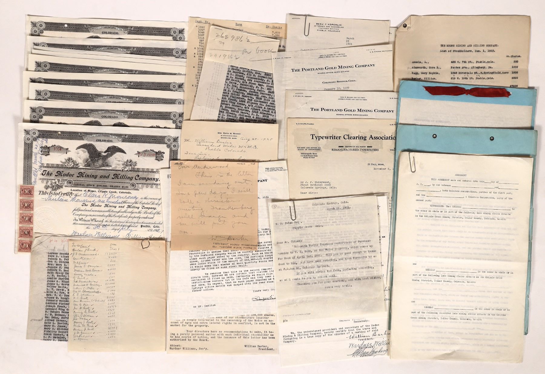 3 issued 1927-28, and 10 u/i Modoc Mining and Milling stocks. Also Modoc and other Colorado mining ephemera. Colorado