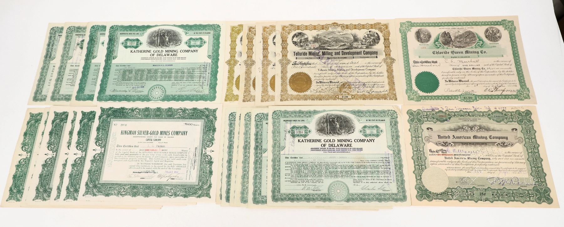 Mohave Co. Stocks, 5 Different c.1910-1930. Telluride Mining, Milling and Development Company (4) Kingman Silver-Gold Mines Company (9) Katherine Gold Mining Company of Delaware (11) Chloride Queen Mining Company (1) United American Mining Company (1) All issued. See photos.