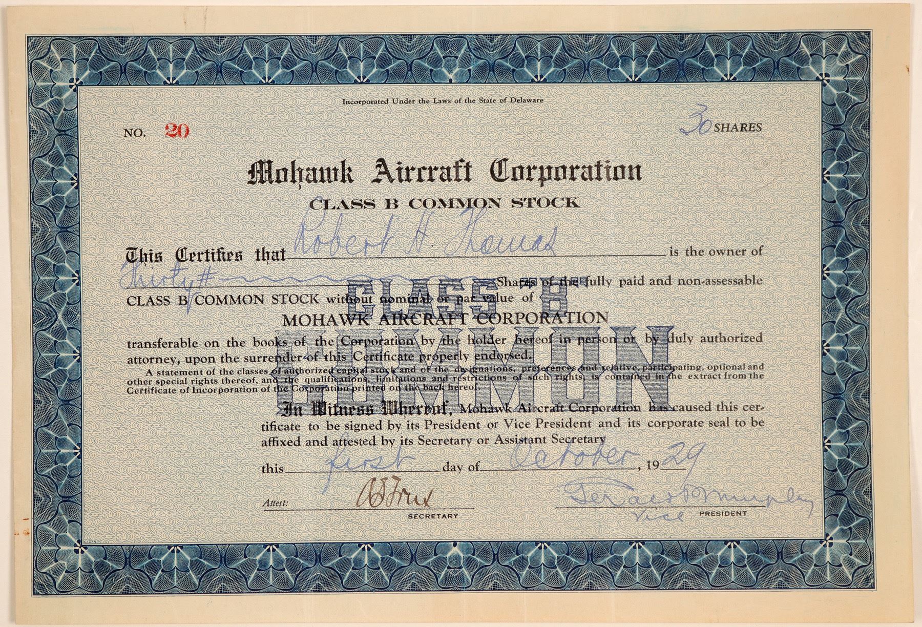 Inc. in Delaware. No. 20, issued for 30 shares to Robert Thomas on Oct. 1st, 1929. Signed by vice-president GP Murphy and secretary Trux. Not cancelled. Blue border and background, black print. 7.75 x 11" Folds, toning. Located in Minneapolis. Manufactured low-wing monoplanes, according to Air Travel News, 1929. President was Stanley Partridge. Ken Prag Collection