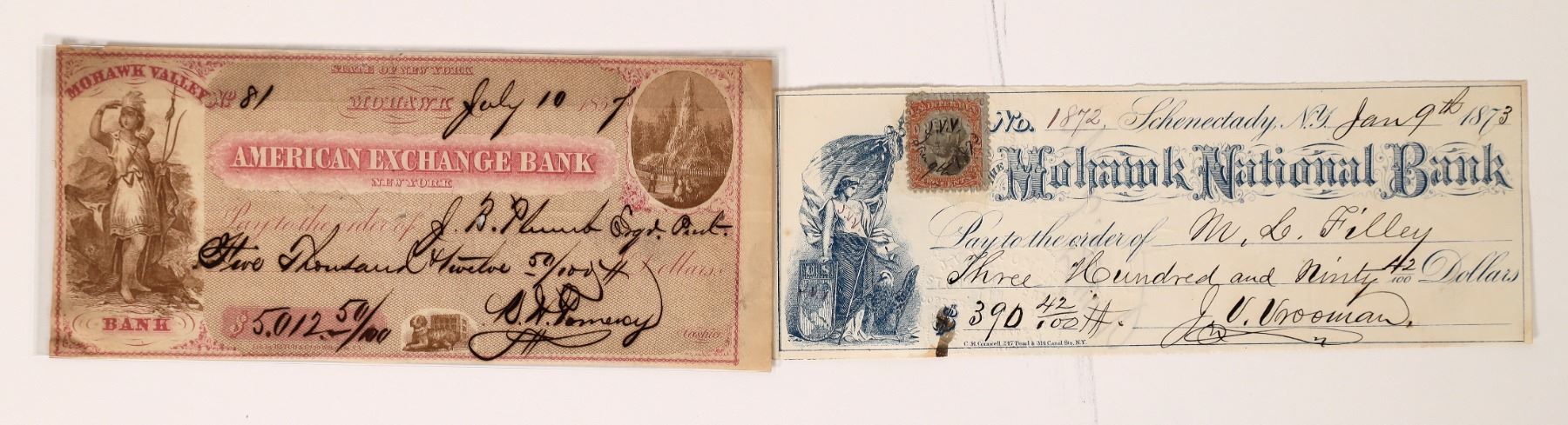 Pair of nice Mohawk, NY checks, c. 1857 and 1873. Mohawk banks made some very artistic checks as seen here. New York Mohawk