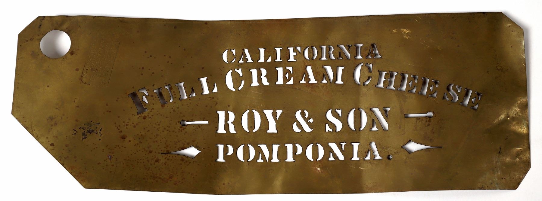 Metal stencil, 11 1/2 x 4 inches: "California / Full Cream Cheese / Roy & Son / Pomponia." Stamped "MOISEKlinknew Co. / Makers / 1212 Market St. / Opp. 8th / San Francisco, Cal."