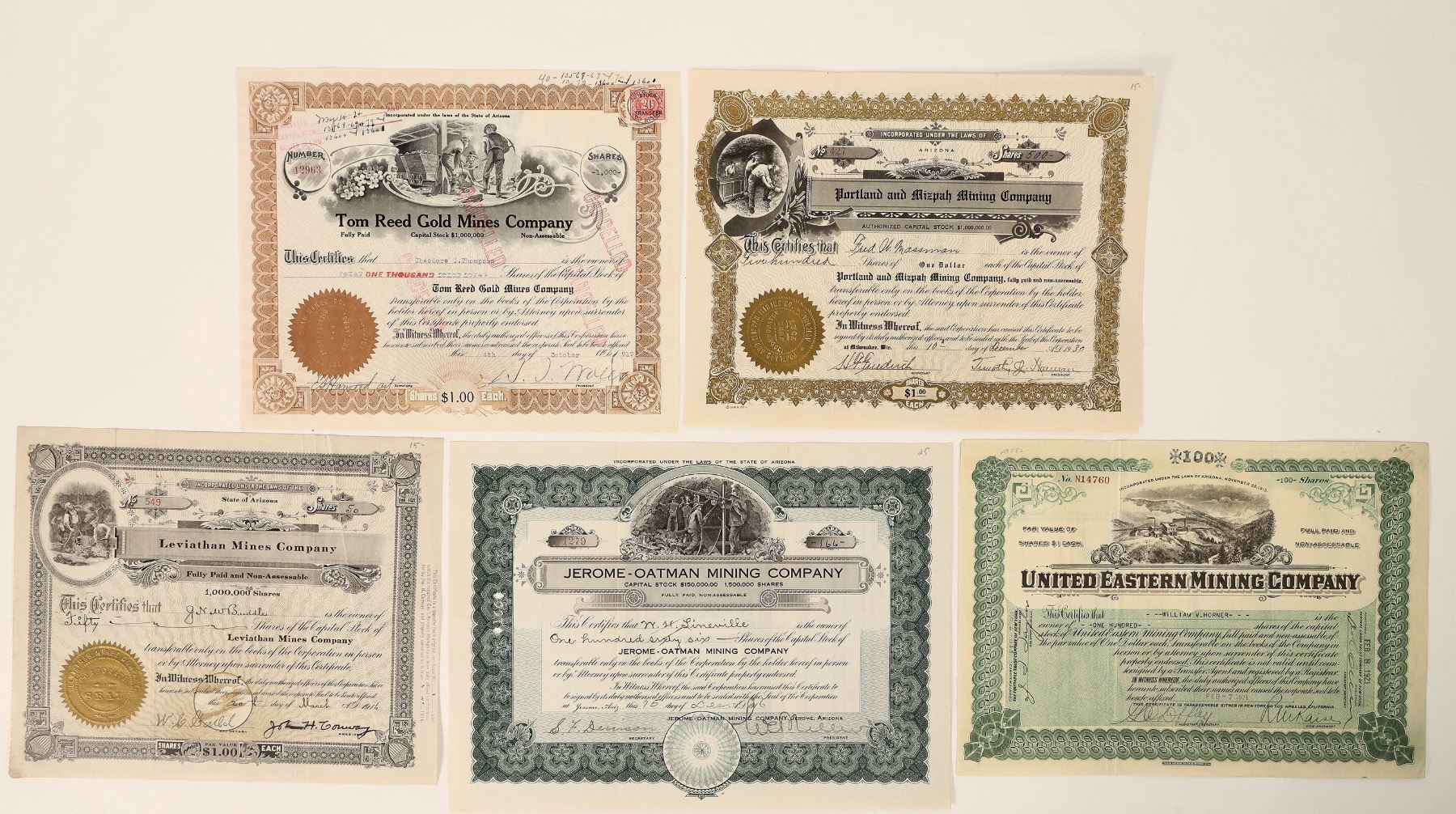 All issued. 1919 Tom Reed Gold. 1921 United Eastern, a big company with multiple properties including Oatman-staple holes.1916 Jerome Oatman Mining. 1916 Leviathan Mines-located in Copper Canyon in Cedar district. 1930 Portland and Mizpah Mining-located in Music Mountains near Hackberry.[ Mojave county Arizona