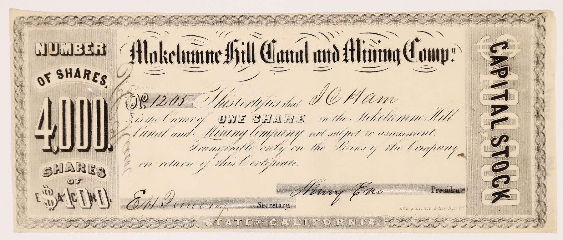 Incorporated in the State of California. Certificate No. 1205 issued for one share to J.C. Ham. No date listed, however most likely between 1852 and 1854. Signed by Henry Eno as President and E. Pomeroy as Secretary. Not cancelled. Endorsed by J.C. Ham on reverse. Black print on creme paper; printer: Lith. Britton and Rey, S.F. 3.5 x 8.75". An attorney and prospector, Henry Eno was an important pioneer in both California and later Nevada Mining history. His letters spanning 20 years provide an intimate glimpse in the mining camps Mokelumne Hill in the early 1850's, Alpine County in the mid 1860's and White Pine, County, Nevada in the late 1868-9. (Reference: Twenty Years on the Pacific Slope - Letters of Henry Eno from California and Nevada 1848-1871 by Turrentine Jackson.) The Mokelumne Hill Canal and Mining Company was organized in 1852, and a 16 mile canal was constructed for $180,000 from the South Fork of the Mokelumne River to the mining and agricultural districts around Mokelumne Hill. The area boomed with the arrival of water in 1853. This company was one of a number of western financed ditch companies organized for bringing water to the California placer gold deposits and Mokelumne Hill was one of the richest areas of California's Mother Lode. This company was the predecessor for the Mokelumne Hill and Camp Seco Ditch Co. They first built a wood flume, but replaced it with a ditch at a cost of $500,000. These ditch or canal companies charged for the water by the inch. In 1853 water arrived from the Mokelumne River and the area boomed. This company later reorganized as the Mokelumne Hill and Campo Seco Canal Company and extended to Campo Seco and mining camps along its course. The company later reorganized as the Mokelumne Hill and Campo Seco Canal Company. (ref: Browne, 1868, p195 and calaverashistory.org). Mokelumne Hill California Franklin Collection