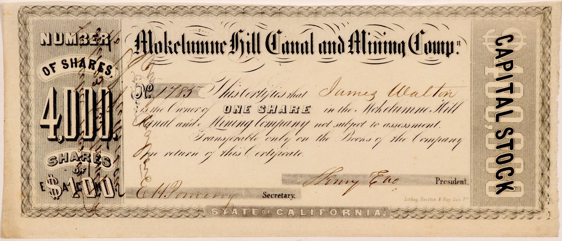 Incorporated in the State of California. Certificate No. 1785, issued for one share to James Walton. No date listed, however most likely between 1852 and 1853 (reverse has 1853 transfer date). Signed by Henry Eno as President and E. Pomeroy as Secretary. Not cancelled. Black border and print. Britton & Rey, SF. 3.75 x 9"Creases, uneven edges. An attorney and prospector, Henry Eno was an important pioneer in both California and later Nevada Mining history. His letters spanning 20 years provide an intimate glimpse in the mining camps Mokelumne Hill in the early 1850’s, Alpine County in the mid 1860’s and White Pine, County, Nevada in the late 1868-9. (Reference: Twenty Years on the Pacific Slope – Letters of Henry Eno from California and Nevada 1848-1871 by Turrentine Jackson.) The Mokelumne Hill Canal and Mining Company was organized in 1852, and a 16 mile canal was constructed for $180,000 from the South Fork of the Mokelumne River to the mining and agricultural districts around Mokelumne Hill. The area boomed with the arrival of water in 1853. This company was one of a number of western financed ditch companies organized for bringing water to the California placer gold deposits and Mokelumne Hill was one of the richest areas of California's Mother Lode. This company was the predecessor for the Mokelumne Hill and Camp Seco Ditch Co. They first built a wood flume, but replaced it with a ditch at a cost of $500,000. These ditch or canal companies charged for the water by the inch. In 1853 water arrived from the Mokelumne River and the area boomed. This company later reorganized as the Mokelumne Hill and Campo Seco Canal Company and extended to Campo Seco and mining camps along its course. The company later reorganized as the Mokelumne Hill and Campo Seco Canal Company. (ref: Browne, 1868, p195 and calaverashistory.org) Ken Prag Collection