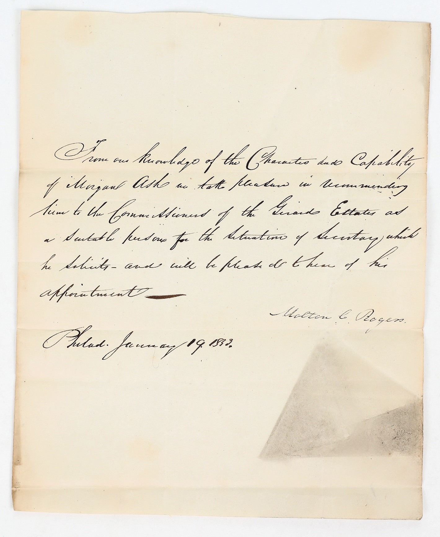Personal letter , signed by Molton Rogers 1833 regarding an appointment. In protective sleeve and in very good condition.