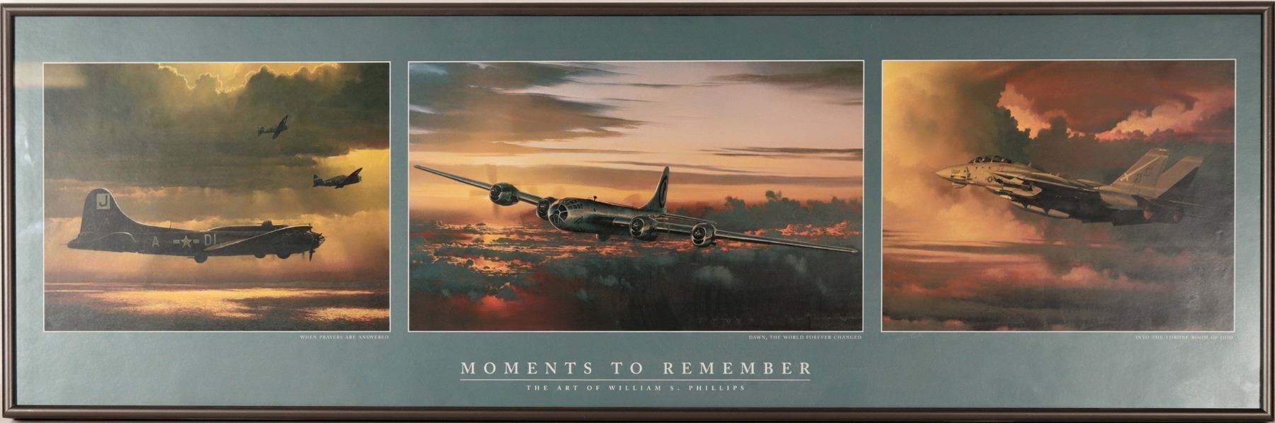 This lithograph called "Moments to Remember" by Wiliam S. Philllips is a cllection of three seperate prints: When Prayers are answered, Dawn, the World Forever Changed, and into The Throne of God. Framed at 12 in. X 36 in.