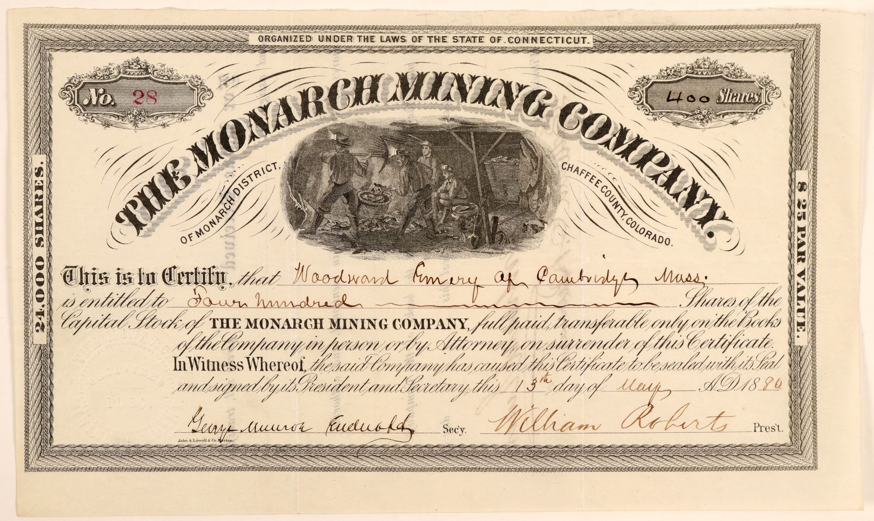 "of Monarch District, Chaffee County, Colorado" (printed on either side of vignette). Inc. in CT. No. 28, issued for 400 shares to Woodward Emery of Cambridge on May 13th, 1880. Signed by president William Roberts and the secretary. Not cancelled. Black border and print. Vignette of miners with headlamps. Printed by John A. Lowell, Boston. 6 x 10" Horizontal and vertical folds. Clean. Not listed in Corbett or Corregan & Lingane, though there are numerous Monarch mines in Colorado listed. According to the 1883 Report of the Director of the Mint, the Monarch Mining Company claims were on Monarch Mountain, and Robert J. Clark was the owner/manager. The 1884 edition has more detail: the mine was located in 1878, there is 3,000 ft. of development, and the main tunnel is in 300 ft. "The mine throughout is in perfect working order, and in every direction gives evidence of careful and intelligent mining" (Report of the Director of the Mint, 1884, pg. 250-251] () Ken Prag Collection