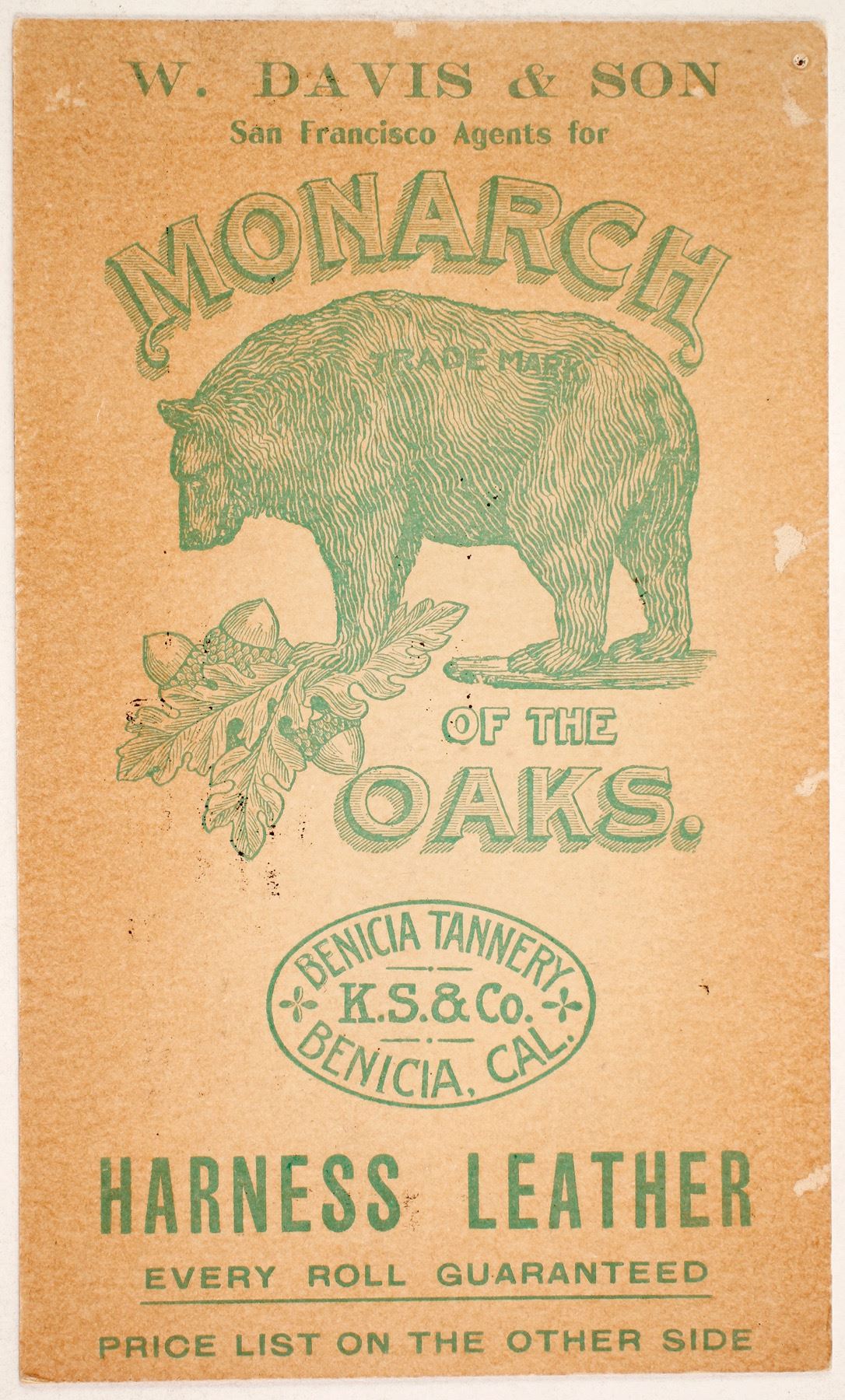 W. Davis & Son San Francisco Agents for Monarch of the Oaks harness leather. Bear and oak/acorn pictorial front, rear price list. Rare! 5.5x3.25". Some toning, 1 pin hole State: California City: San Francisco Date: